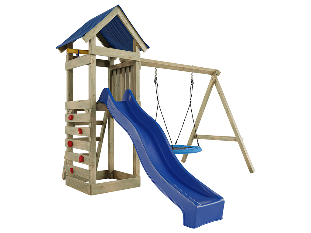 Materiaal: hout, B x D x H: 327 x 317 x 258 cm, incl. klimwand, incl. blauwe glijbaan + nestschommel