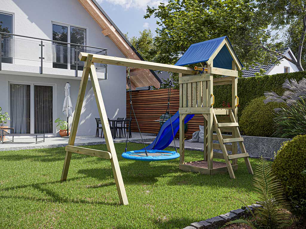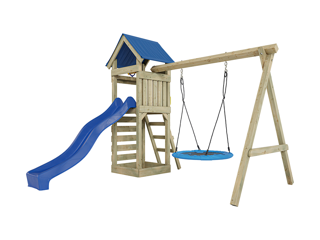 Geïmpregneerde speeltoren "Easy" incl. dubbele schommel, blauwe glijbaan en nestschommel