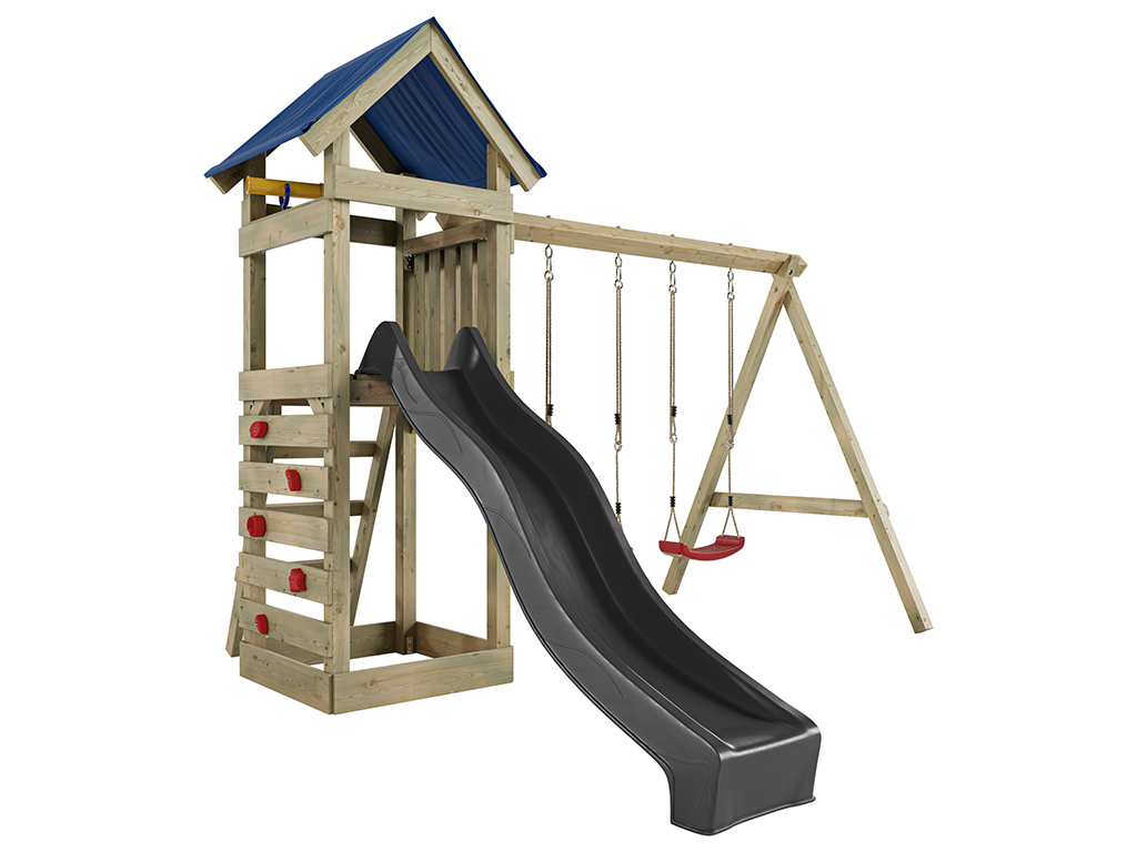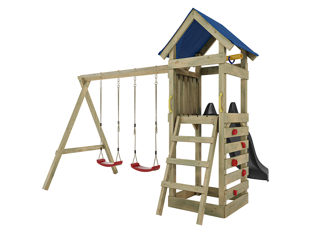 | Leveringsomvang: | Eenvoudige KDI speeltoren, dak van zeildoek, dubbele schommel, 2x schommelzitje of 1x nestschommel (afhankelijk van keuze), 4 schommelhaken, 2 handgrepen, zandbak, ladder, klimwand, klimstenen, 1x telescoop, 1x glijbaan |