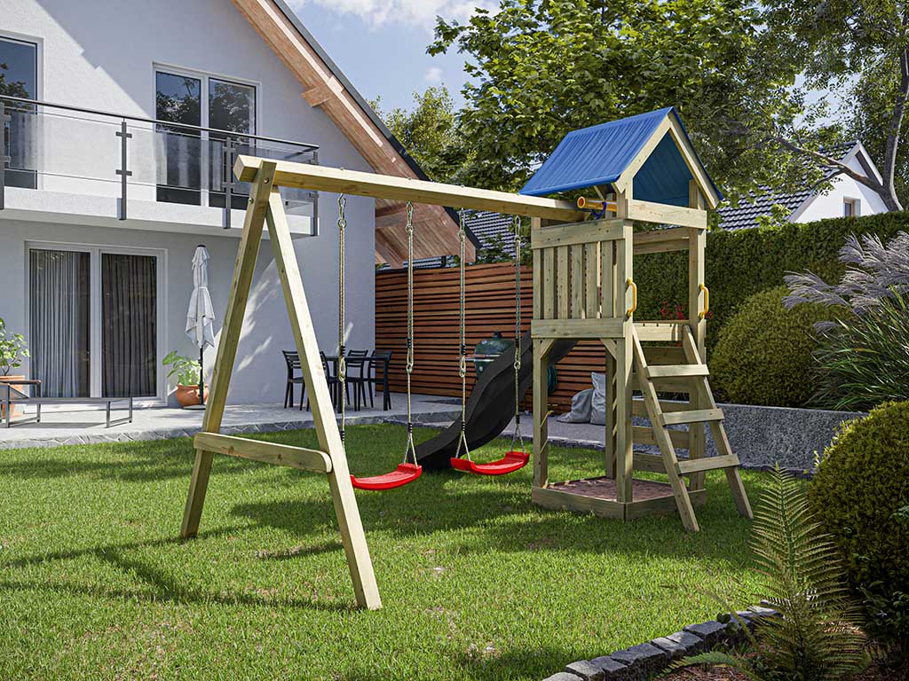 | Leveringsomvang: | Eenvoudige KDI speeltoren, dak van zeildoek, dubbele schommel, 2x schommelzitje of 1x nestschommel (afhankelijk van keuze), 4 schommelhaken, 2 handgrepen, zandbak, ladder, klimwand, klimstenen, 1x telescoop, 1x glijbaan |