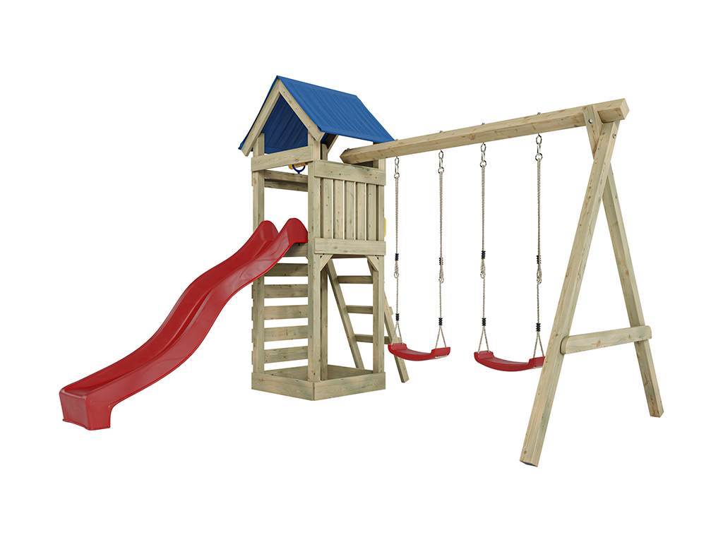 Geïmpregneerde speeltoren Easy incl. dubbele schommel incl. rode glijbaan en rode schommelzitjes