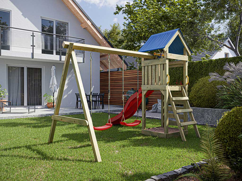 - Inclusief een blauwe dubbele schommel met een stevige houten schommelbalk van 9 x 9 cm.