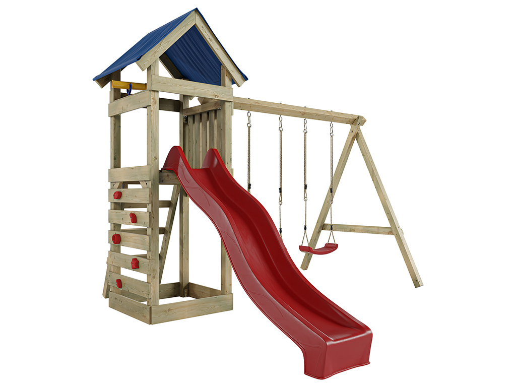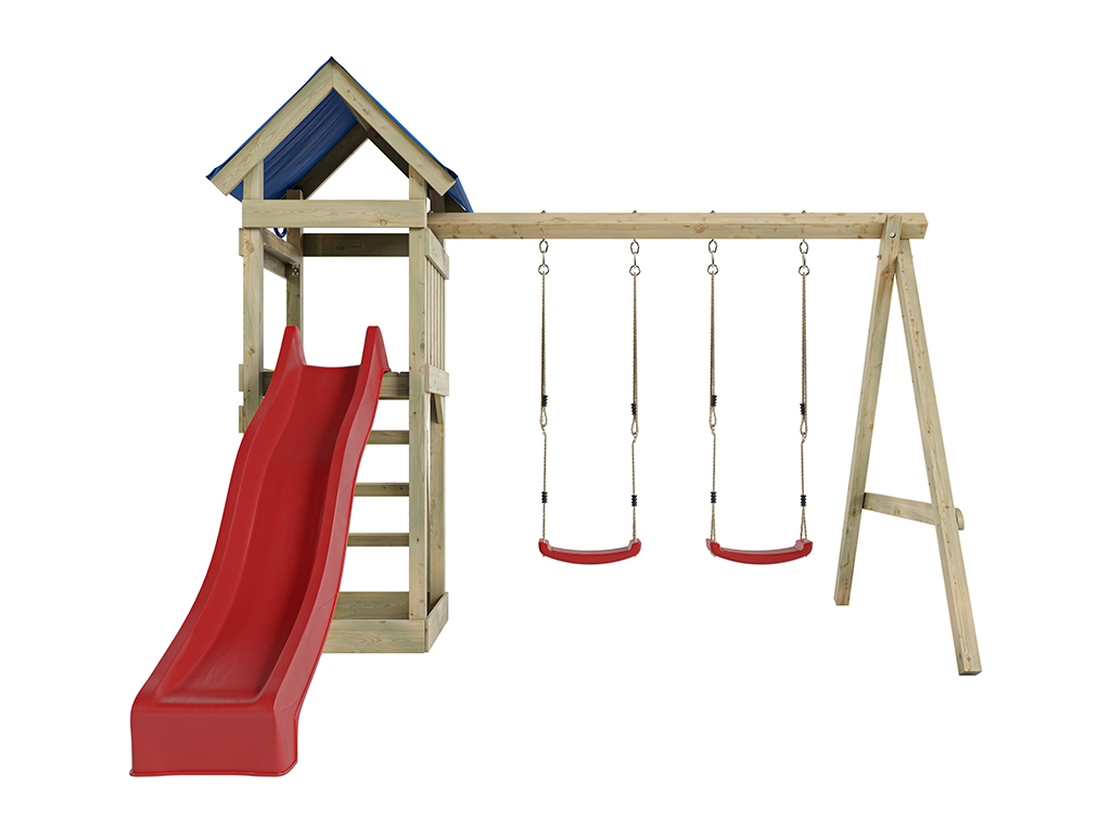 Geïmpregneerde speeltoren Easy incl. dubbele schommel incl. rode glijbaan en rode schommelzitjes