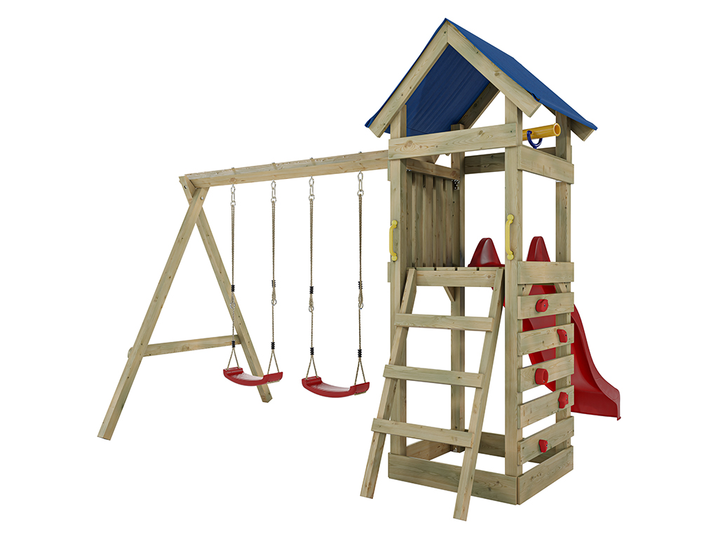 - Inclusief een blauwe dubbele schommel met een stevige houten schommelbalk van 9 x 9 cm.