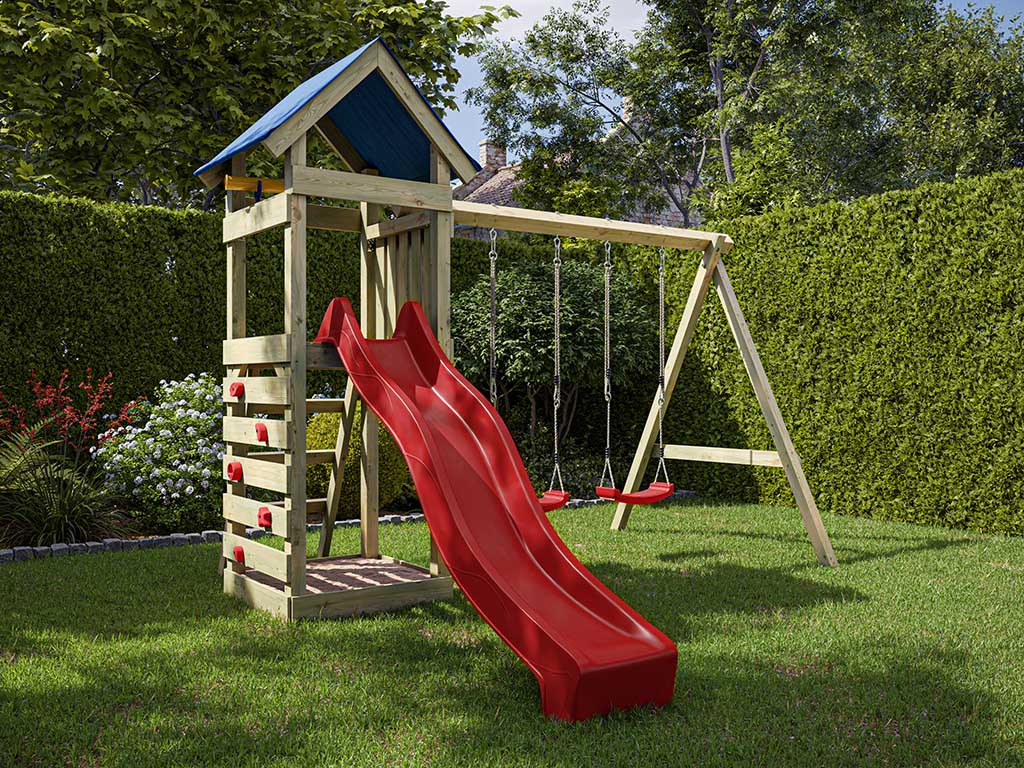 Geïmpregneerde speeltoren Easy incl. dubbele schommel incl. rode glijbaan en rode schommelzitjes