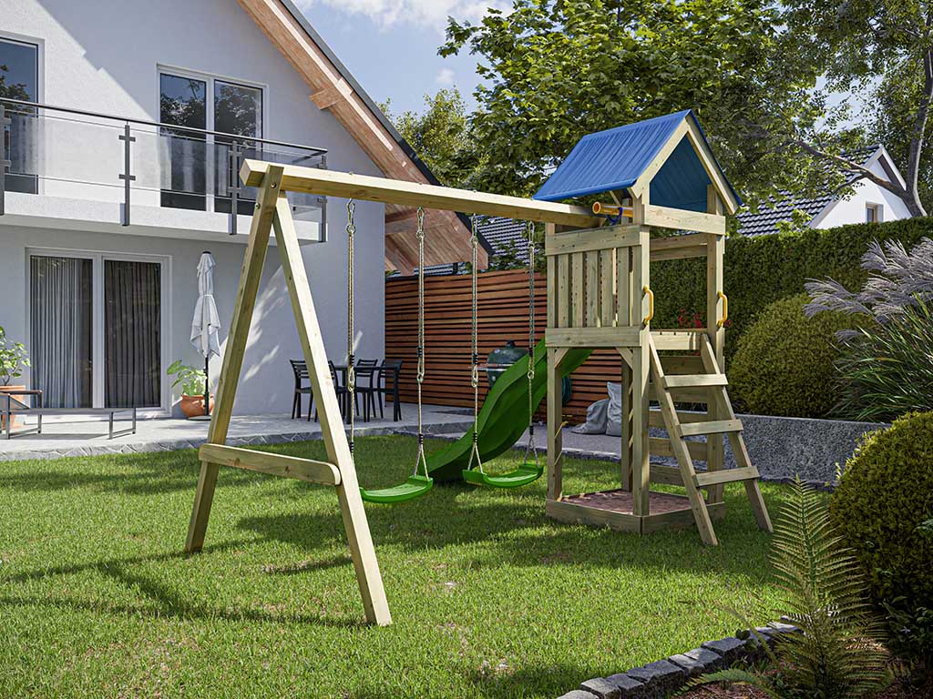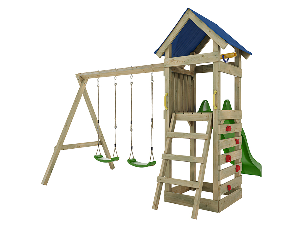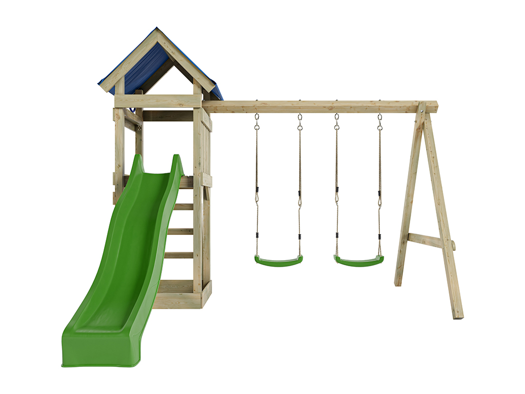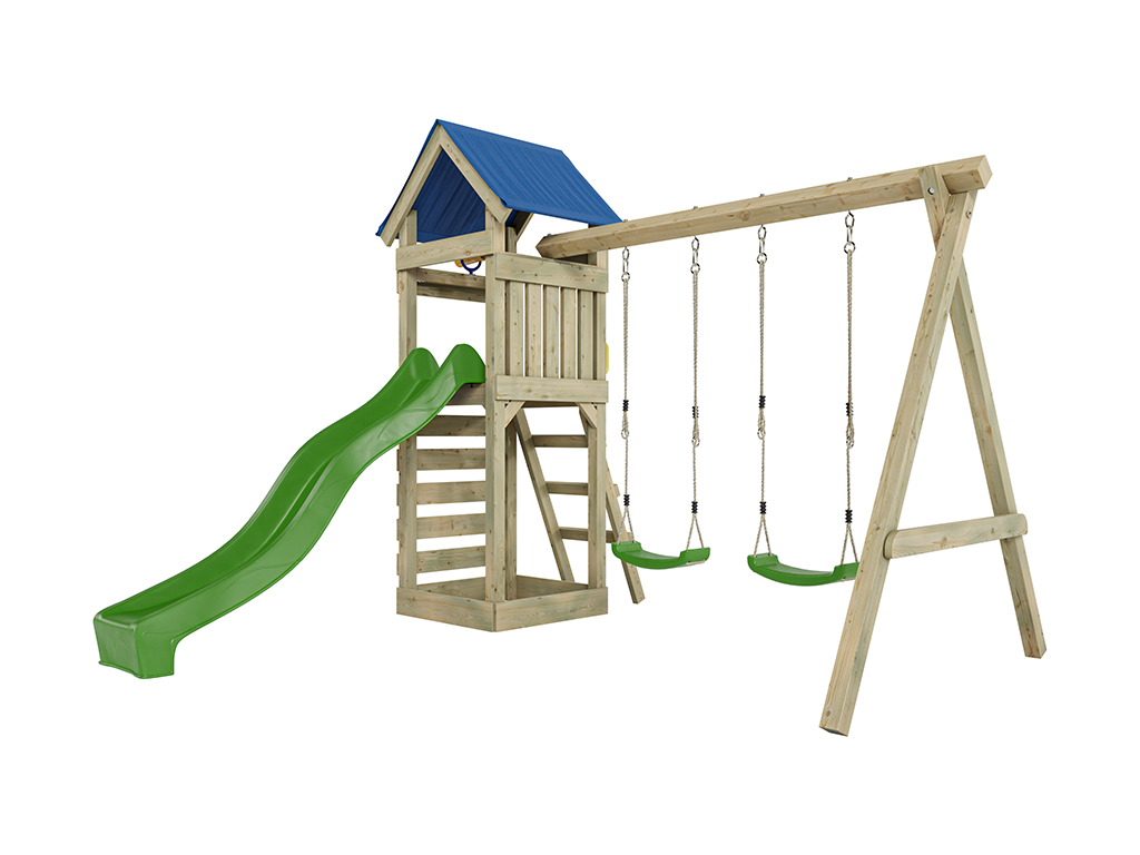 Geïmpregneerde speeltoren Easy met dubbele schommel en groene glijbaan, incl. groene schommelzitjes
