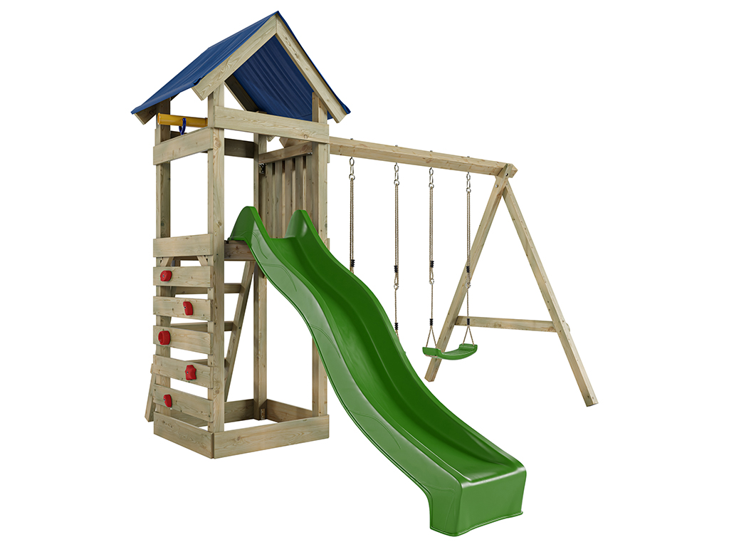 | Leveringsomvang: | Eenvoudige KDI speeltoren, dak van zeildoek, dubbele schommel, 2x schommelzitje of 1x nestschommel (afhankelijk van keuze), 4 schommelhaken, 2 handgrepen, zandbak, ladder, klimwand, klimstenen, 1x telescoop, 1x glijbaan |