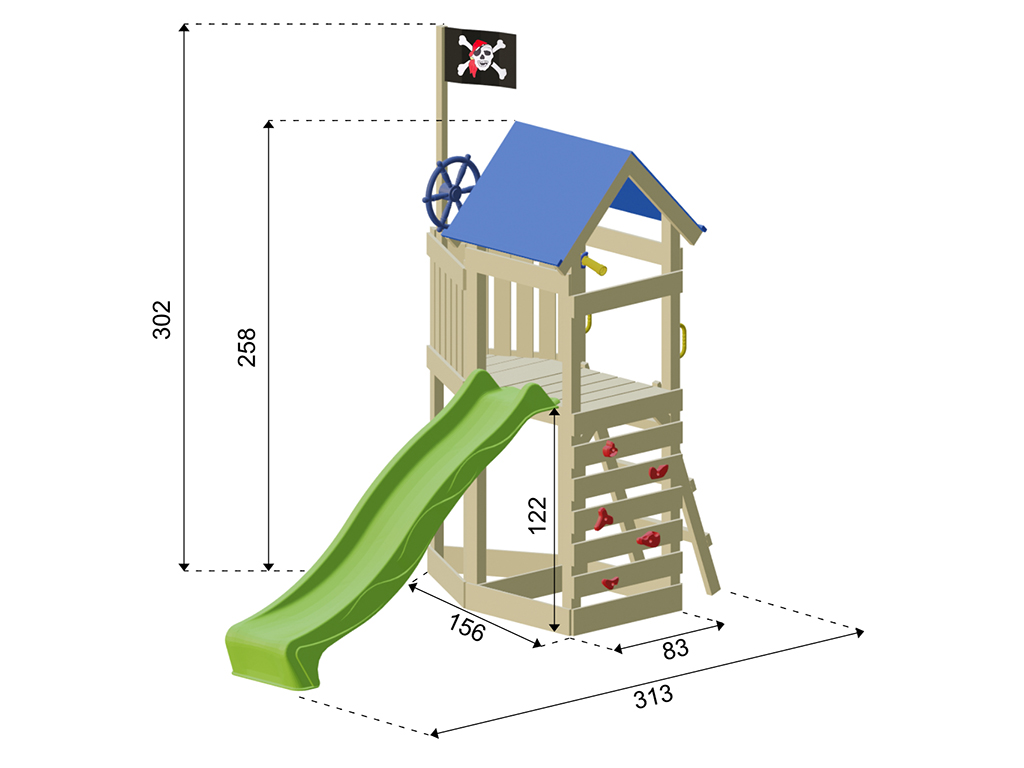 - Speeltoren Captain Jolly, geïmpregneerd, zeildoekdak, 2 handgrepen, zandbak, ladder, klimwand, klimmstenen, 1x telescoop, 1x stuurwiel, 1x piratenvlag, 1x glijbaan