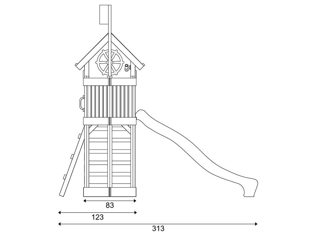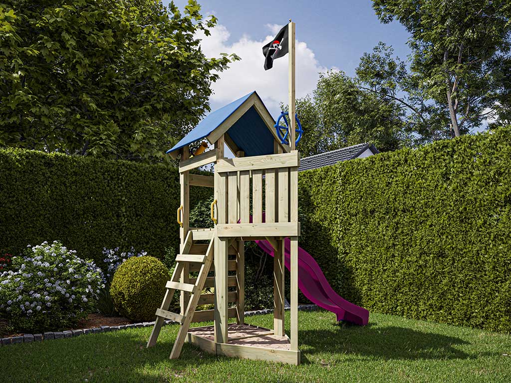 Voor kleine ontdekkingsreizigers en stoere piraten verandert deze speeltoren de tuin in een spannend avontureneiland. De Captain Jolly-vlag is het herkenbare teken voor alle piraten en maakt van dit buitenspeelgoed de droom van ieder kind dat graag op een piratenschip vaart. Het grote “schip” met zijn afmetingen van 313 x 156 x 250 cm biedt een dak als beschutting tegen de ruwe zee en helpt bij het ontdekken van onbekende eilanden – zelfs als het “stormt”. Het uitkijkplatform ligt op 122 cm hoogte, zodat kinderen alles goed kunnen overzien. Aan bakboord (links) nodigt een blauwe glijbaan uit om razendsnel het avontuur in te duiken. Aan de achterzijde is er een klimwand en aan stuurboord een ladder om in een handomdraai weer aan boord te klimmen.