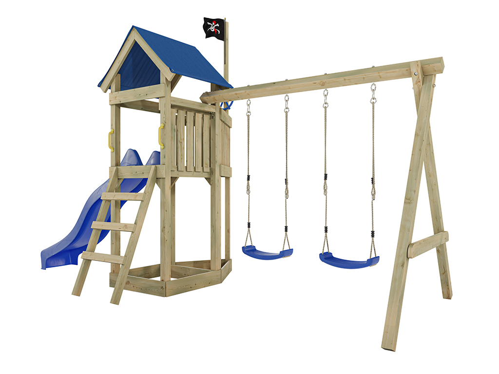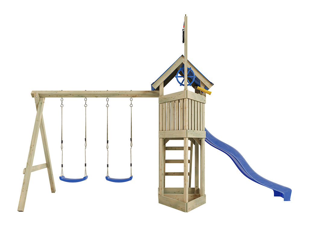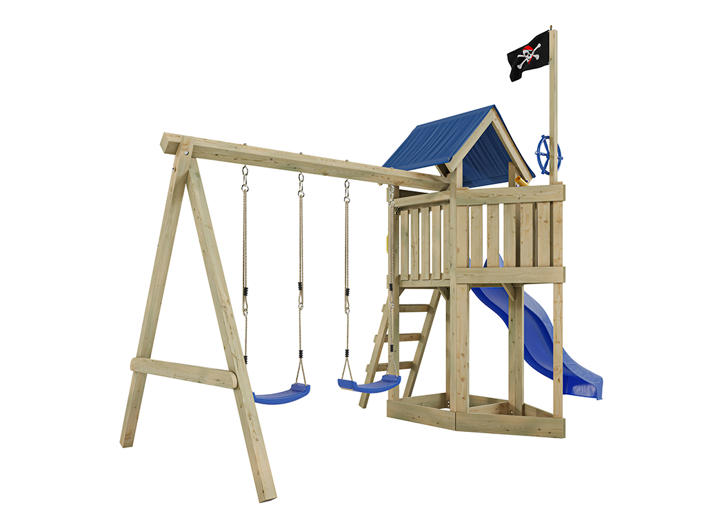 Geïmpregneerde speeltoren "Pirat Captain Jolly" met dubbele schommel incl. blauwe glijbaan en blauwe
