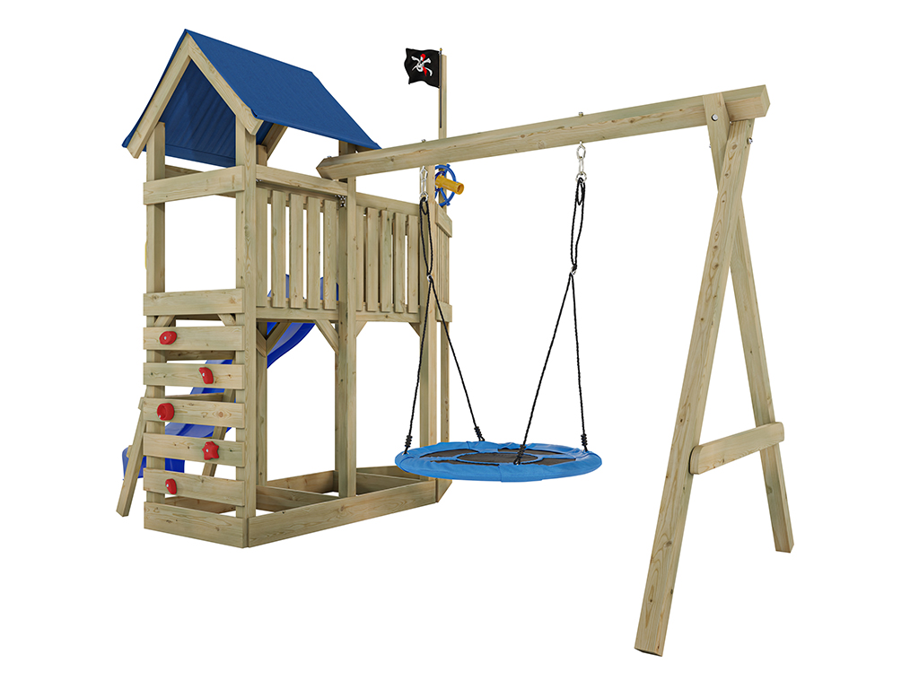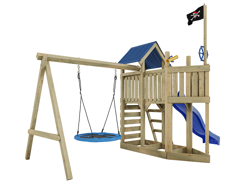 Geïmpregneerde speeltoren "Pirat Captain Snappy" met dubbele schommel incl. blauwe glijbaan en nests