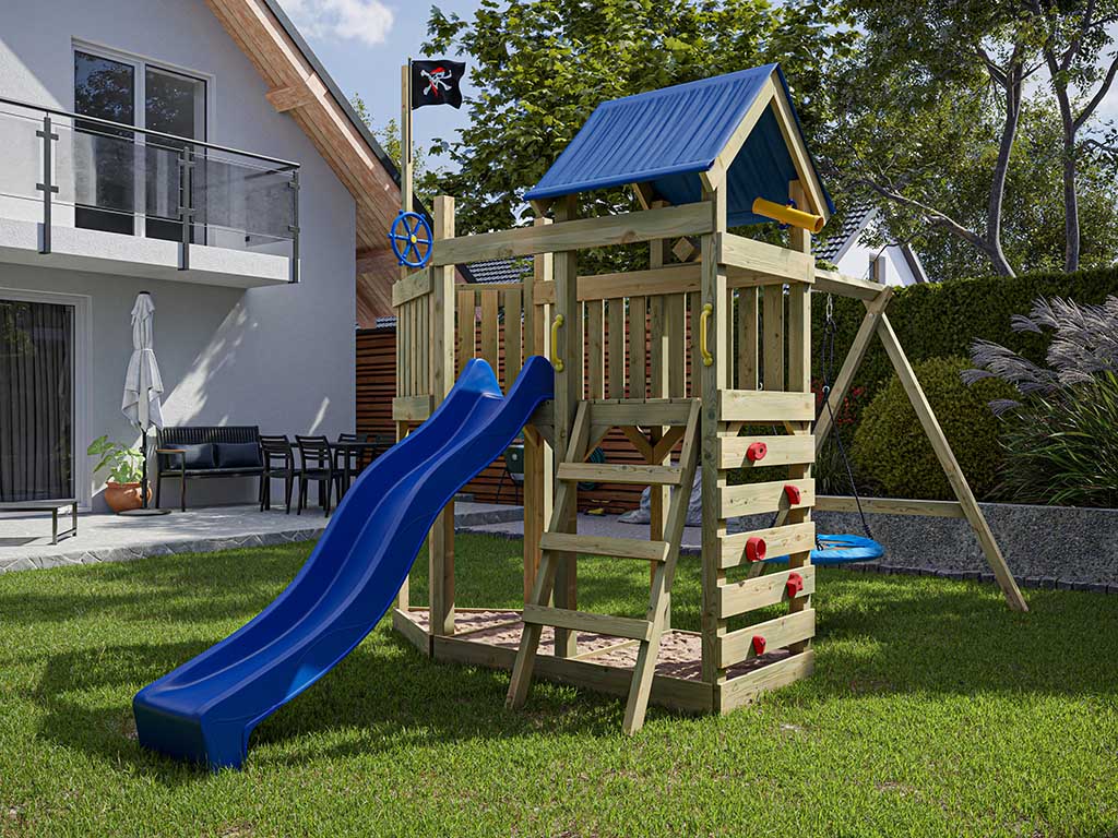 Voor kleine ontdekkingsreizigers en stoere piraten is deze speeltoren een echt avontuurlijk speeltoestel met glijbaan en schommel, compleet met eigen Captain-Jolly-vlag. Deze naam staat symbool voor alle piraten – van veraf herkenbaar en de droom van ieder kind om eronder te varen. Het grote “schip” met zijn afmetingen van 507 x 255 x 258 cm heeft een dak dat beschermt tegen de ruige zee en helpt om zelfs bij storm nieuwe eilanden te ontdekken. Het uitkijkplatform ligt op een hoogte van 122 cm. Voor een snelle duik in het avontuur is er aan bakboord (links) een blauwe glijbaan. Om daarna weer snel uit te varen, kunnen kinderen via de klimwand aan de achterzijde of via de ladder aan stuurboord naar boven klimmen. Verschijnen er andere piraten op volle zee, dan staat de nestschommel klaar om in één zwaai naar het andere “schip” te slingeren.