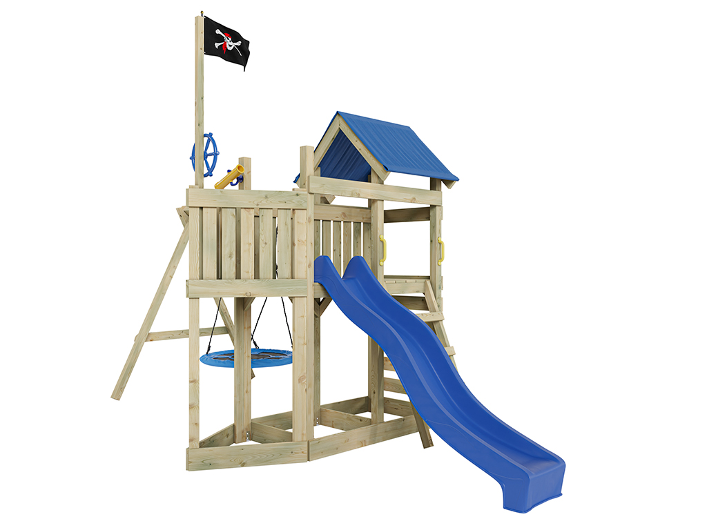 Geïmpregneerde speeltoren "Pirat Captain Snappy" met dubbele schommel incl. blauwe glijbaan en nests