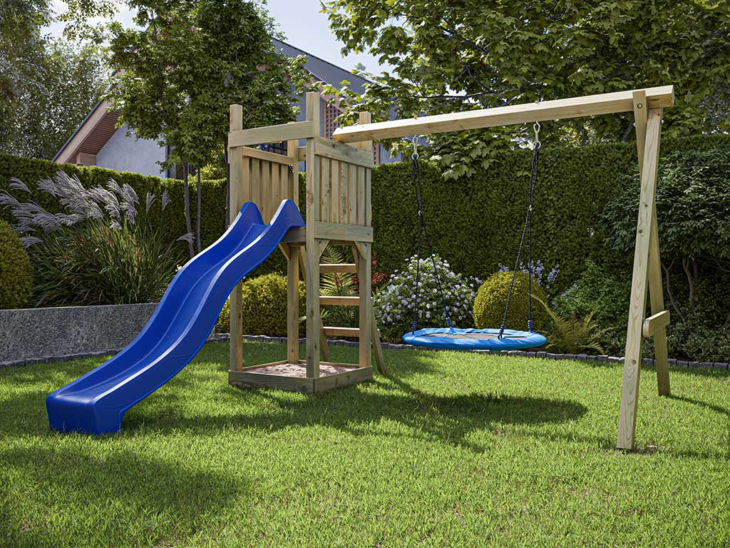 Geïmpregneerde speeltoren "Skinny" incl. dubbele schommel, blauwe glijbaan en nestschommel