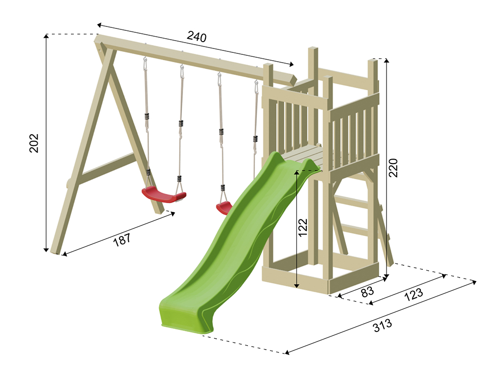 - speeltoren Skinny van geïmpregneerd hout, dubbele schommel, 2x schommelzitje of 1x nestschommel (afhankelijk van de keuze), 4 schommelhaken, 2 handgrepen, zandbak, ladder, 1x glijbaan, ZONDER TELESCOOP