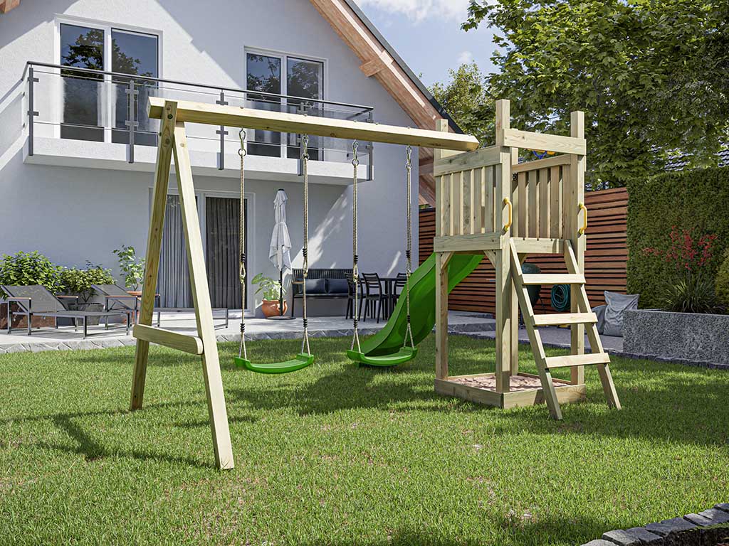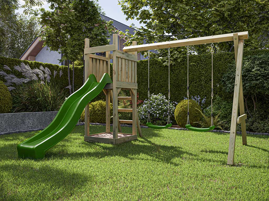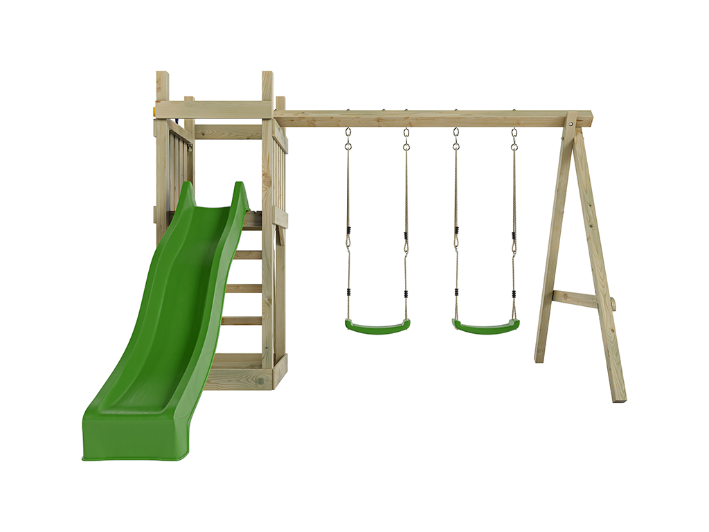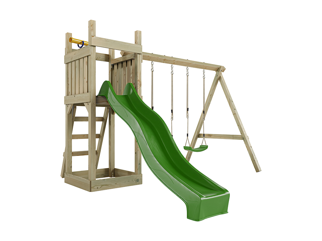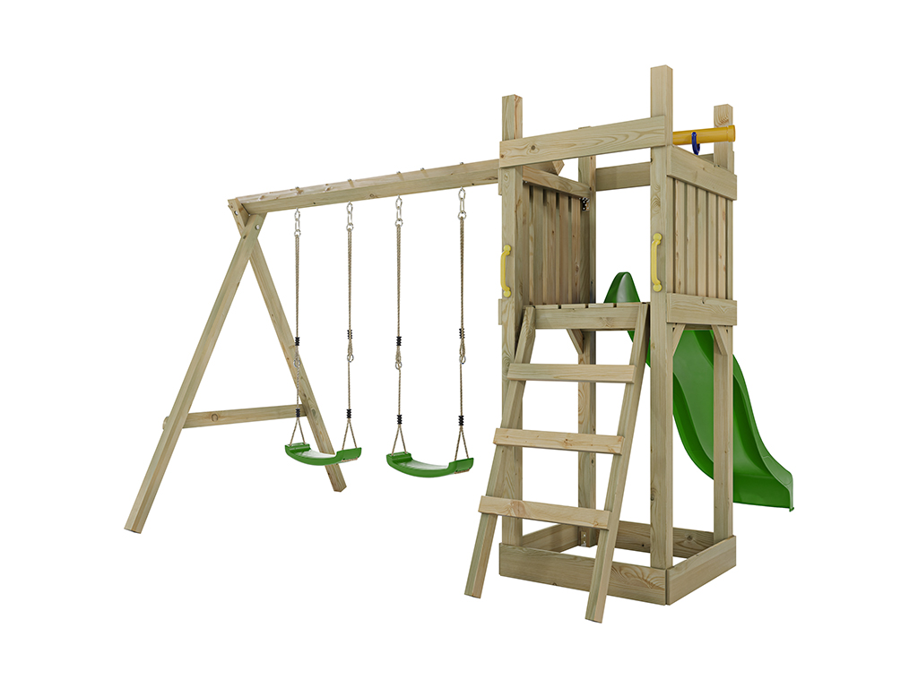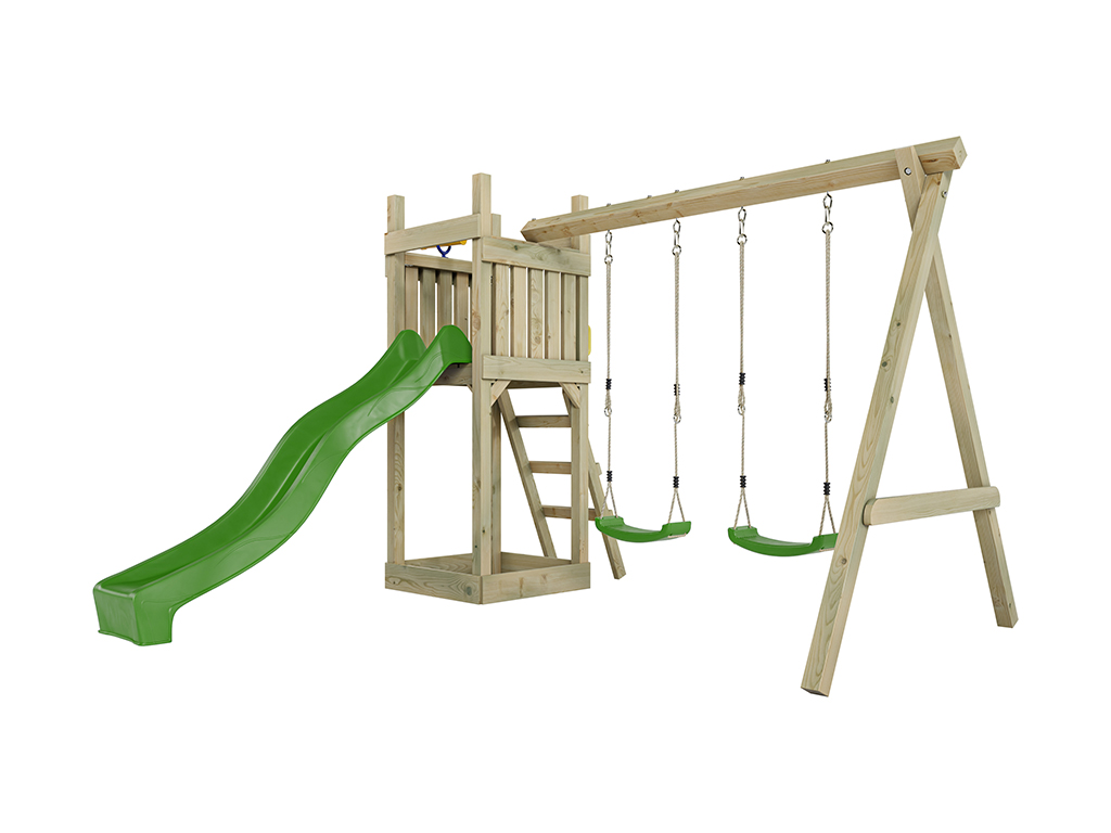 Geïmpregneerde speeltoren "Skinny" incl. dubbele schommel, groene glijbaan en groene schommelzitjes