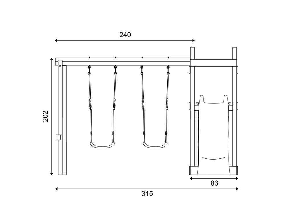 - Speeltoren Skinny geïmpregneerd, dubbele schommel, 2x schommelzitje of 1x nestschommel (naar keuze), 4 schommelhaken, 2 handgrepen, zandbak, ladder, 1x glijbaan, ZONDER TELESCOOP