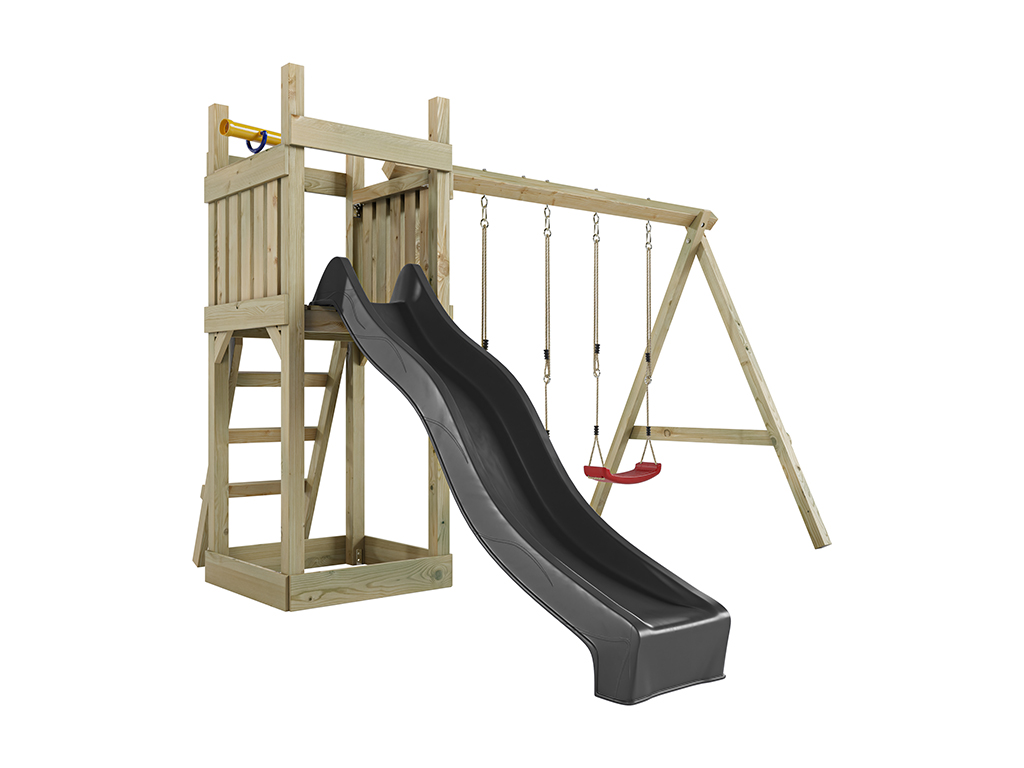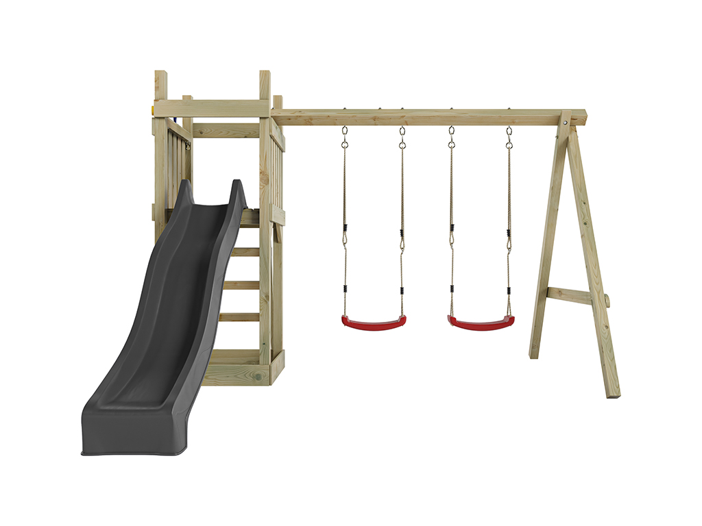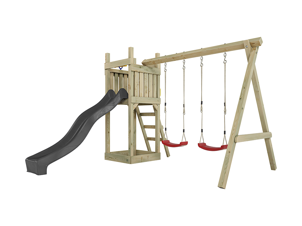 Geïmpregneerde speeltoren Skinny incl. dubbele schommel incl. grijze glijbaan + rode schommelzitjes