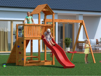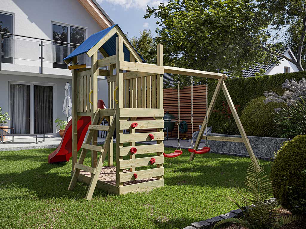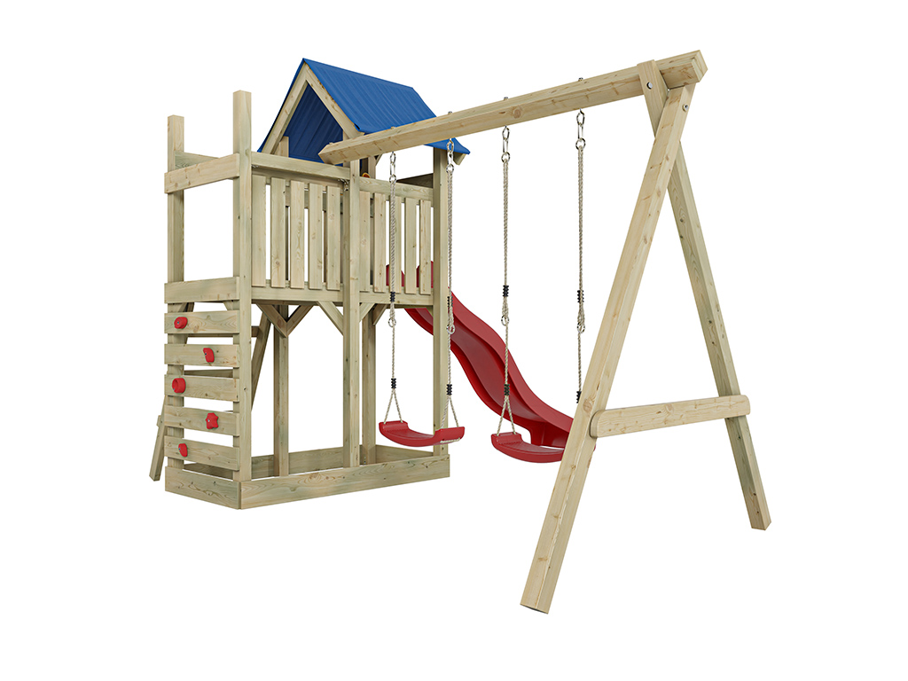 B x D x H: 355 x 386 x 258 cm, incl. klimwand, rode glijbaan en rode schommelzitjes