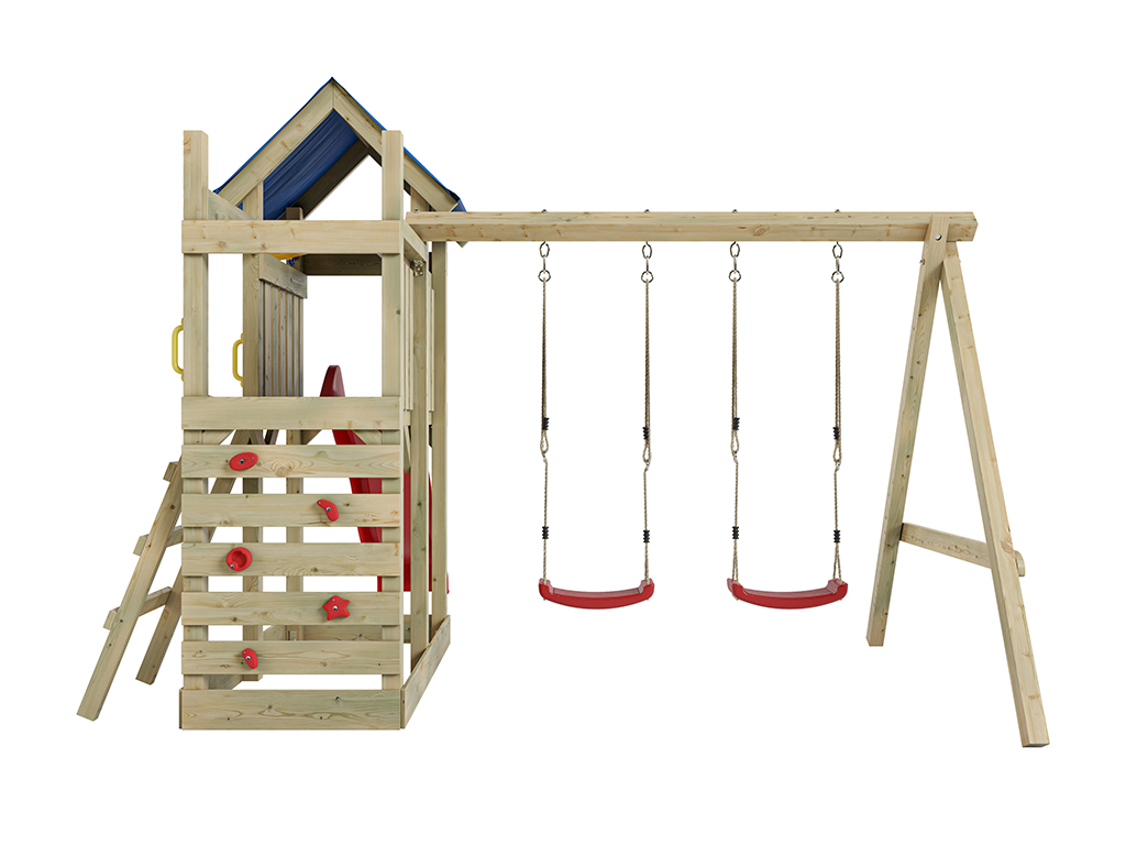 - Inclusief rode dubbele schommel met een stevige schommelbalk van 9 x 9 cm.