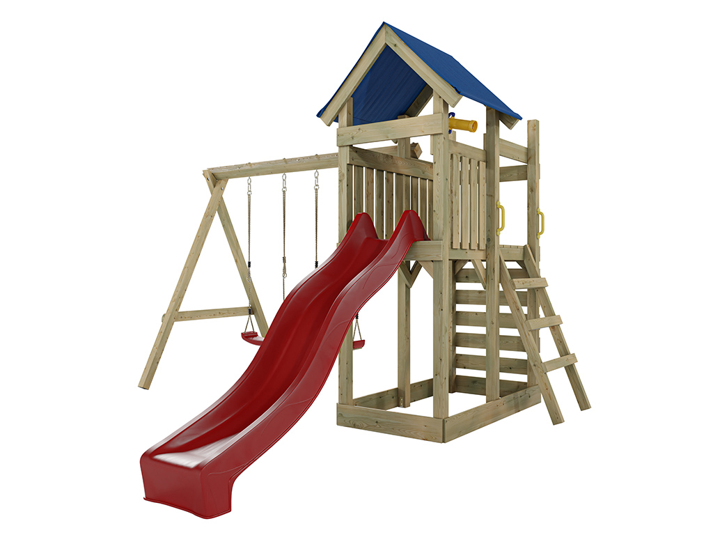 Geïmpregneerde speeltoren "Speedy" met dubbele schommel, incl. rode glijbaan en rode schommelzitjes