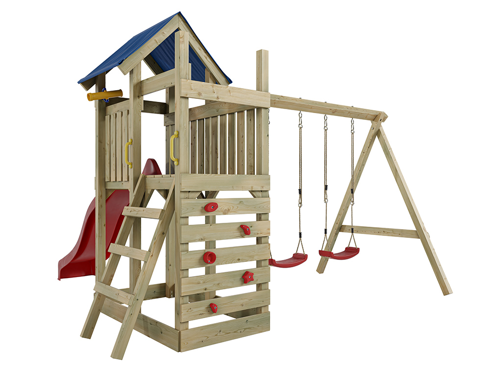 - Speeltoren Speedy van geïmpregneerd hout, zeildak, dubbele schommel, 2x schommelzitje of 1x nestschommel (afhankelijk van de gekozen variant), 4 schommelhaken, 2 handgrepen, zandbak, ladder, klimwand, klimstenen, 1x telescoop, 1x glijbaan