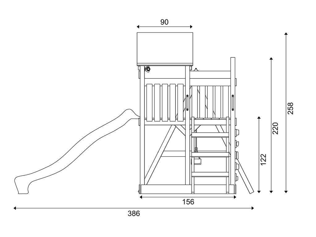 Deze speeltoren biedt je kind unieke speelmomenten vol beweging en avontuur – een echt speelparadijs in de tuin! De buitenafmetingen van dit speeltoestel zijn 355 x 386 cm. De nokhoogte is 258 cm.