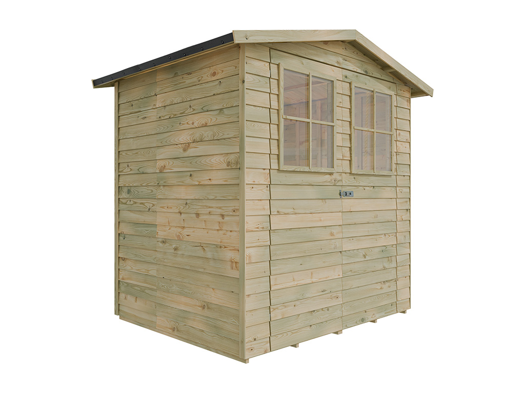 De voorgemonteerde wandelementen worden geleverd als elkaar overlappende planken. De horizontaal gemonteerde houten planken, waarbij de bovenste plank de plank eronder enkele centimeters afdekt, bieden bijzondere bescherming tegen weersinvloeden. De lamellen zijn B 9 mm x D 110 mm en zijn fijn gezaagd. De geleverde vloer en dak van geprofileerd hout zijn eveneens volledig gemonteerd en 14 mm dik. - Enkele deur met lichtuitsparing