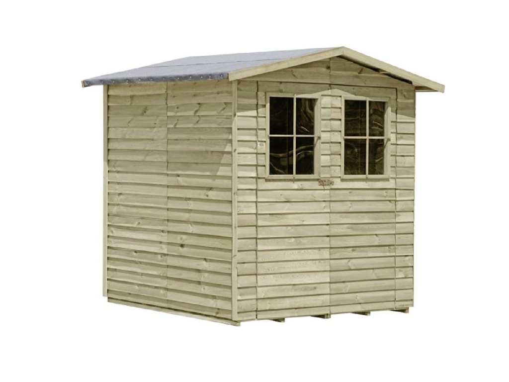 De voorgemonteerde wandelementen worden geleverd als elkaar overlappende planken. De horizontaal gemonteerde houten planken, waarbij de bovenste plank de plank eronder enkele centimeters afdekt, bieden bijzondere bescherming tegen weersinvloeden. De lamellen zijn B 9 mm x D 110 mm en zijn fijn gezaagd. De geleverde vloer en dak van geprofileerd hout zijn eveneens volledig gemonteerd en 14 mm dik. - Dubbele deur met lichtuitsparing