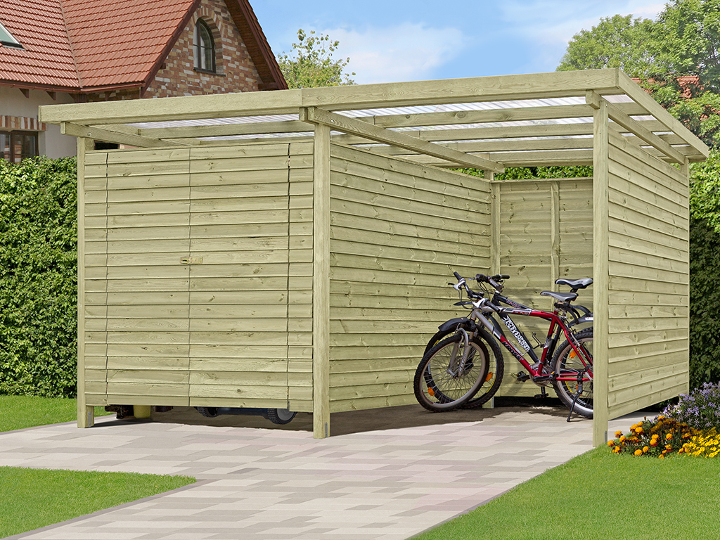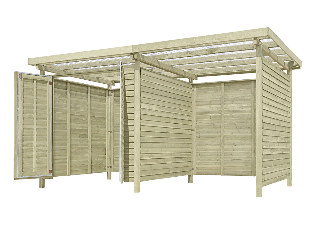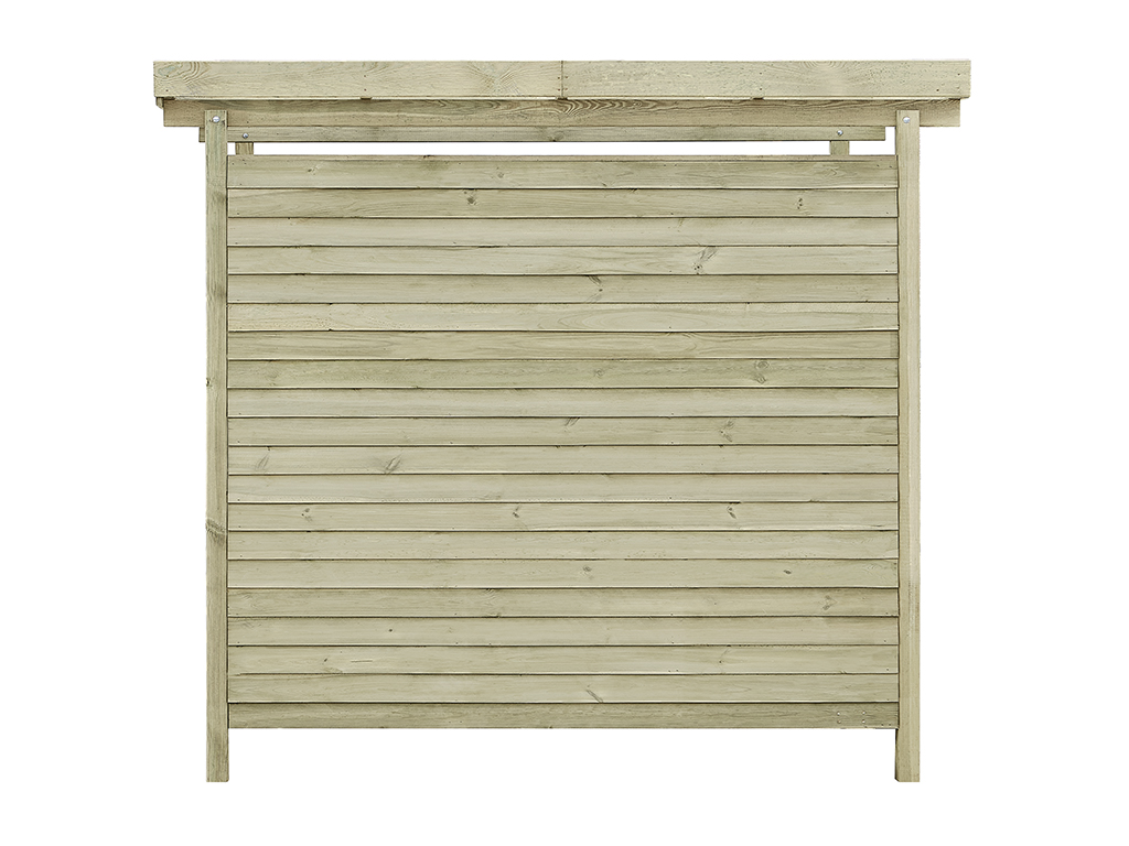 De voorgemonteerde wandelementen worden geleverd als elkaar overlappende planken. De horizontaal gemonteerde houten planken, waarbij de bovenste plank de plank eronder enkele centimeters afdekt, bieden bijzondere bescherming tegen weersinvloeden. De lamellen zijn B 9 mm x D 110 mm en zijn fijn gezaagd. Het dak is bedekt met transparante gegolfde PVC-dakplaten. De stabiele palen van kruishout zijn 7 x 7 cm dik. - Massief houten dubbele deur
