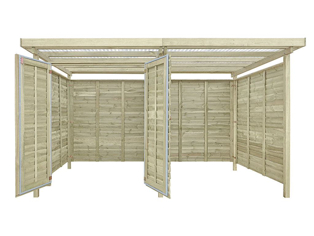 Door de dubbele deuren heb je genoeg ruimte om ook grote spullen op te bergen. De houten elementen zijn al op het achterste stalen frame gemonteerd. - Incl. veranda-overkapping