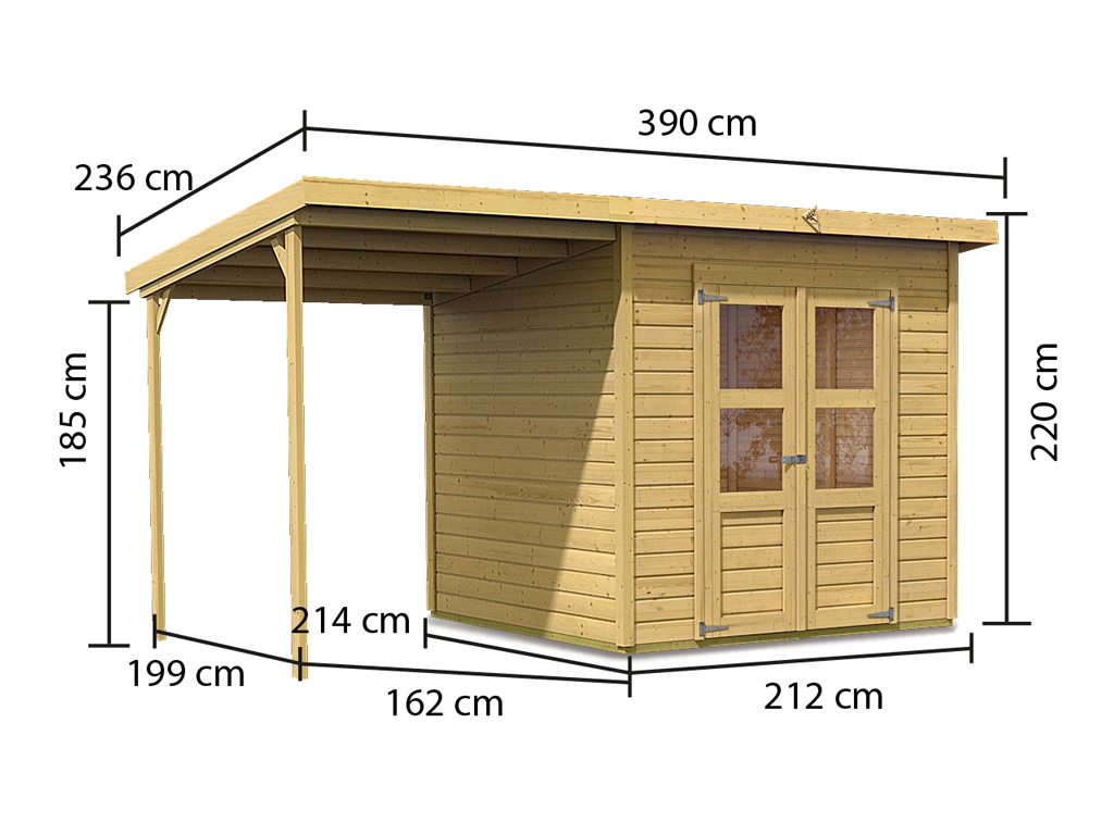 B x D x H: 390 x 236 x 220 cm, Basisafmetingen: B x D: 208 x 210 cm, incl. 166 cm aanbouwdak