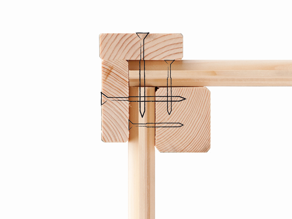 Individuele 14 mm dikke profielen van Scandinavisch sparrenhout worden eenvoudig en snel in elkaar gezet en op een basisframe geschroefd.