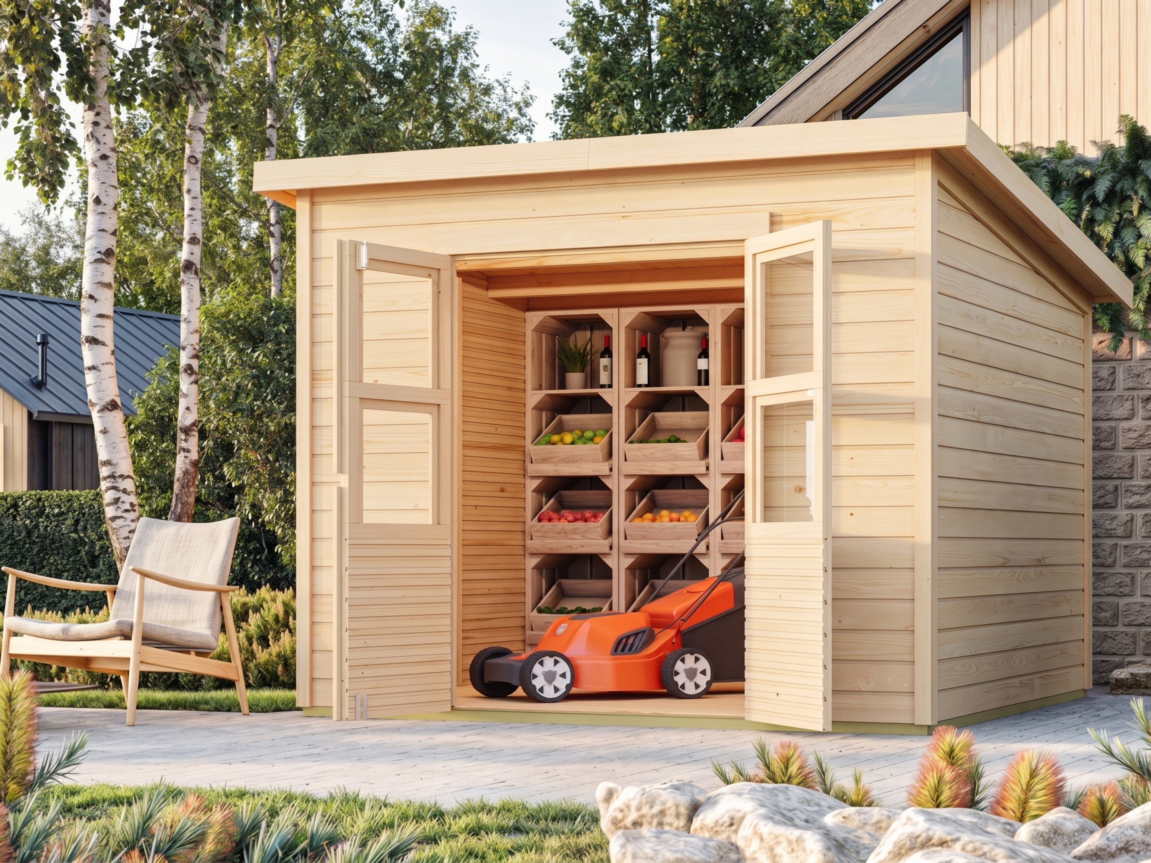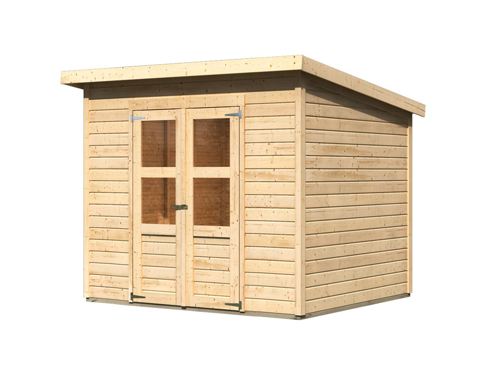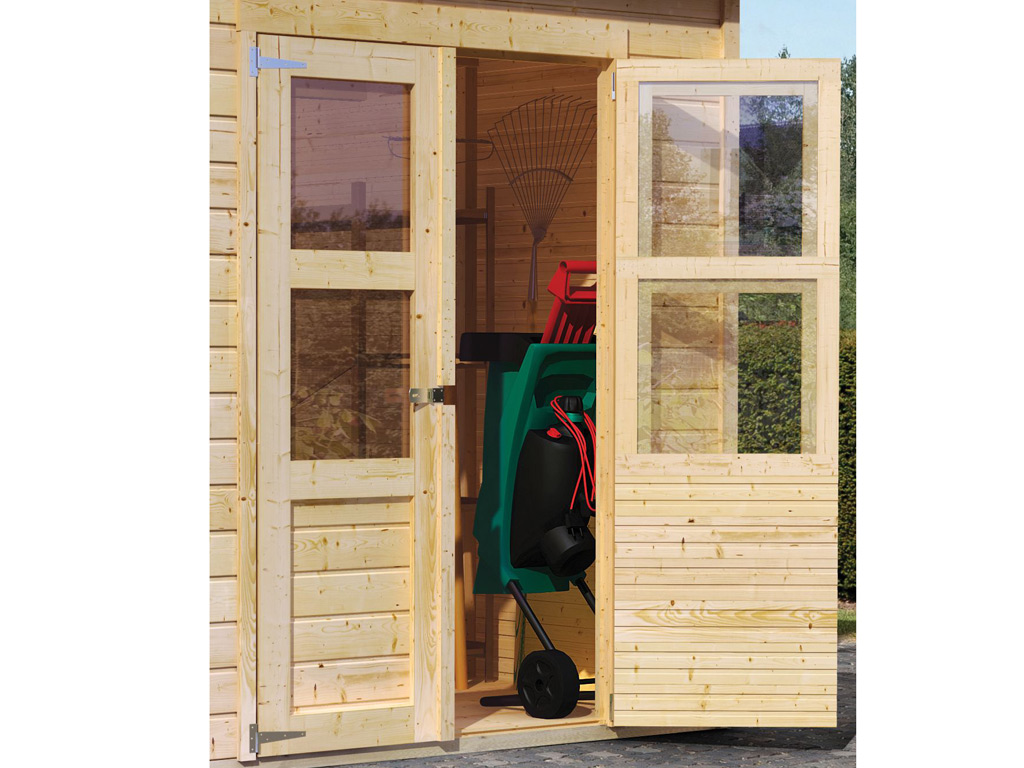 Ruim gereedschapshuisje uit de Karibu ECO-serie met dubbele vleugeldeur inclusief lichtuitsparingen en veiligheidsgrendel.