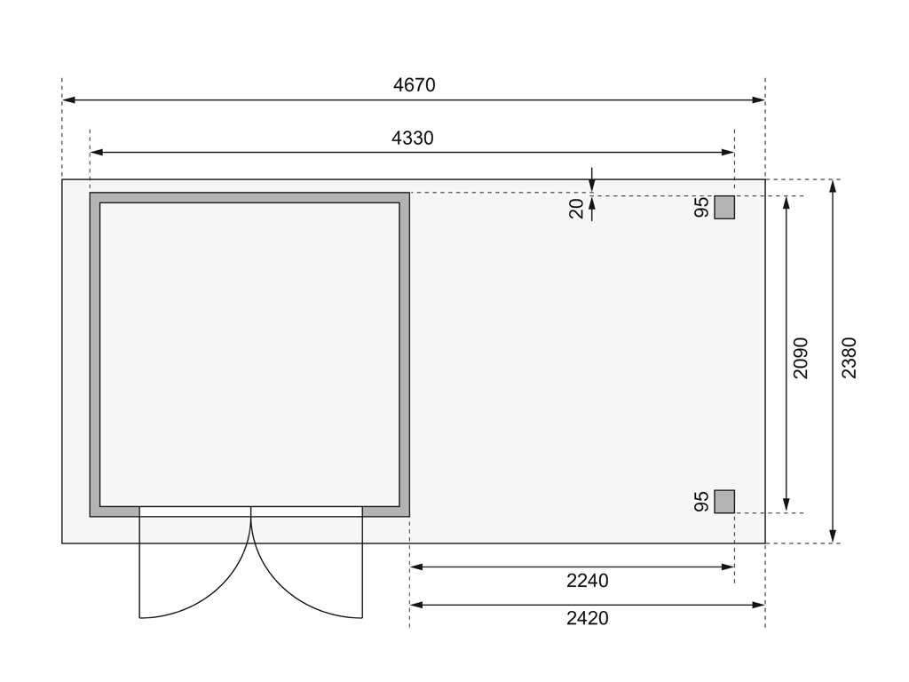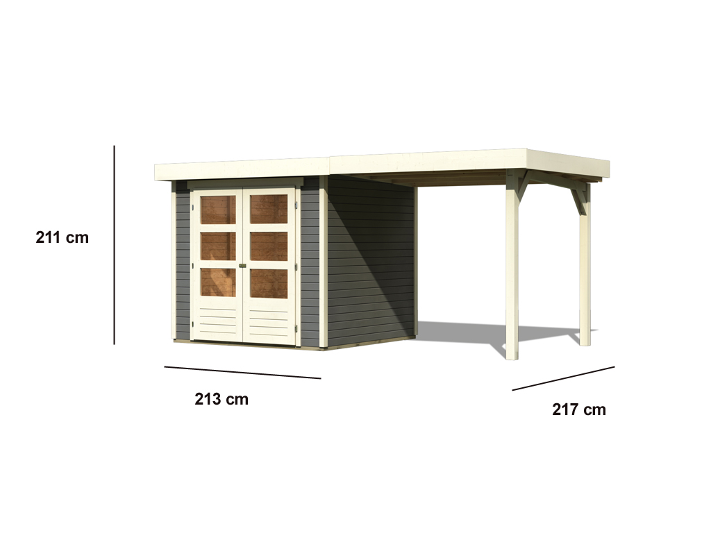 B x D x H: 467 x 238 x 211 cm, funderingsmaat huis: B x D: 209 x 213 cm, incl. 2,4 m aanbouwdak