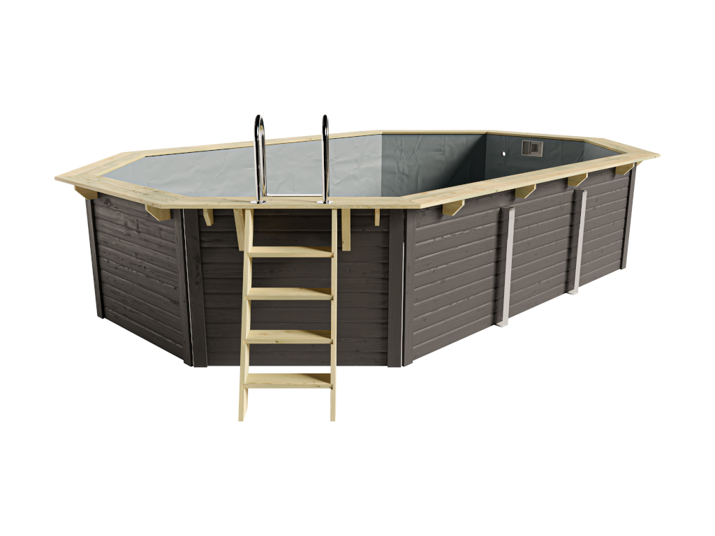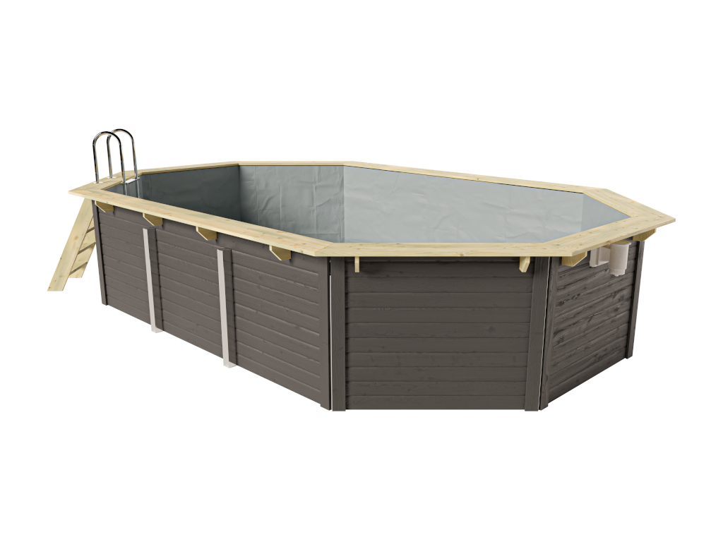 Dit opzetzwembad sluit met zijn houten bassinwand perfect aan op het natuurlijke totaalbeeld van uw tuin en oogt tegelijk hoogwaardig en solide. Met een dikte van 26 cm vormt het pooldeck een fraai afgewerkte rand aan de bovenzijde. Het zwembad wordt geleverd in een moderne antracietkleur.
