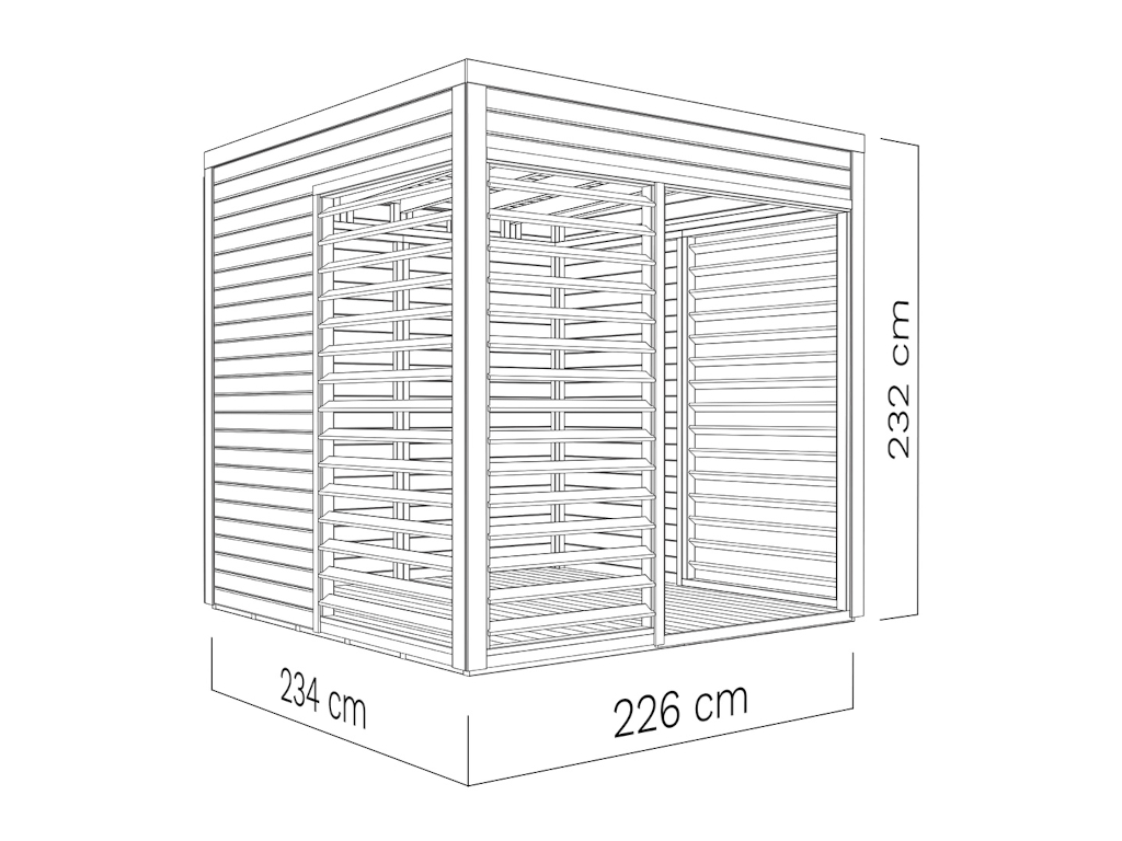 Het paviljoen heeft een breedte van 226 cm, een hoogte van 232 cm en een diepte van 240 cm. Gebruik voor het maken van de fundering de plattegrond en/of de meegeleverde montagehandleiding als leidraad.