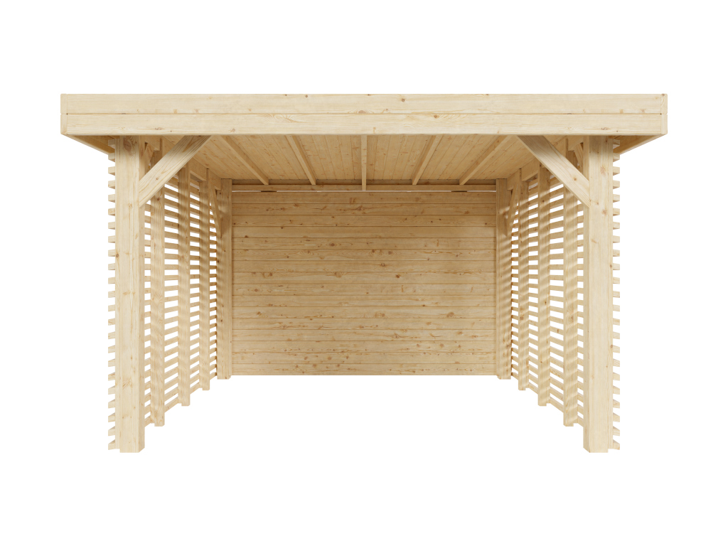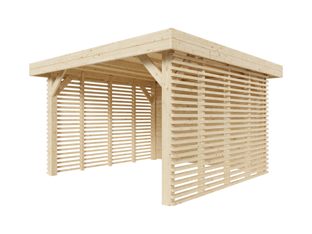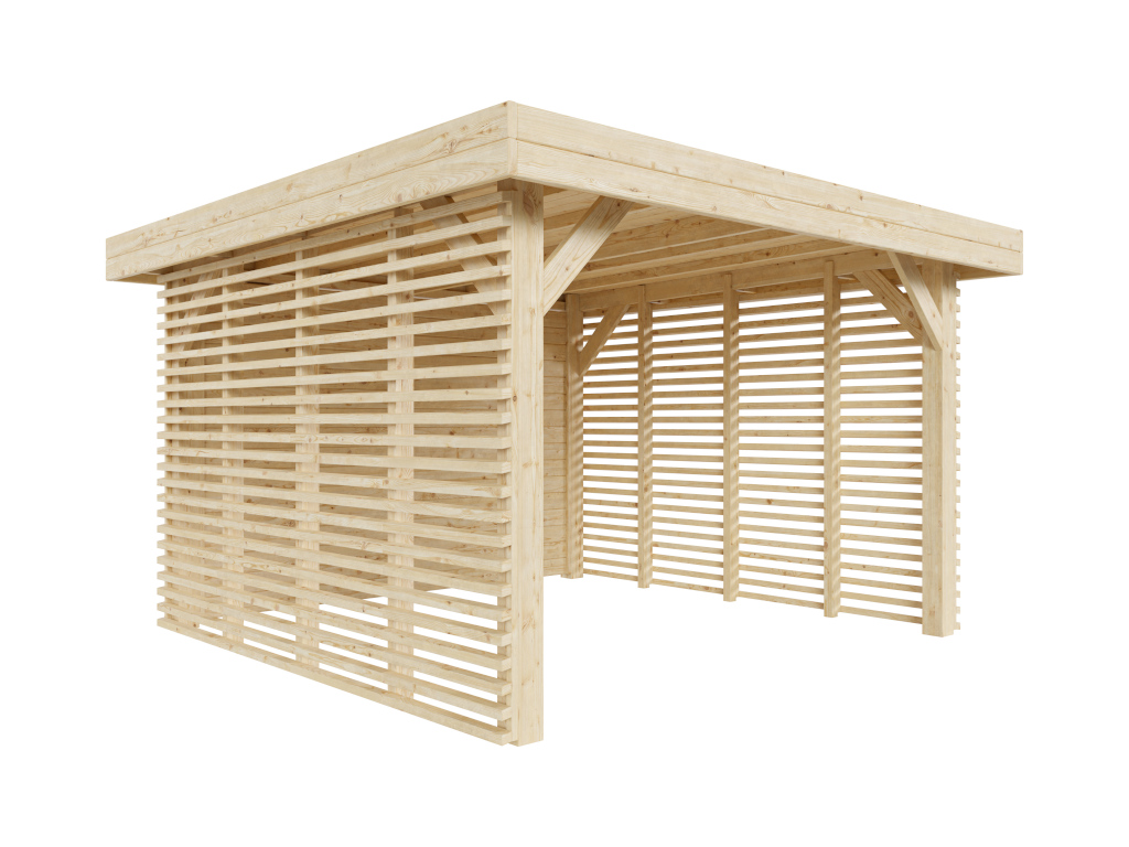 B x D x H: 350 x 350 x 226 cm, sokkelmaat B x D: 300 x 300 cm, incl. 2 lamellenwanden en massieve houten wand, paaldikte 12 cm