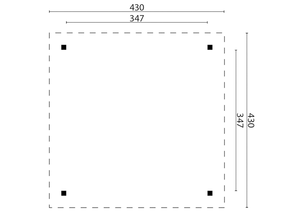 De paviljoen heeft een breedte van 430 cm, een hoogte van 330 cm en een diepte van 430 cm. Houd je bij het maken van de fundering aan de plattegrond en/of de meegeleverde montagehandleiding.