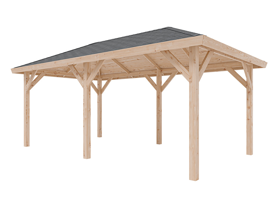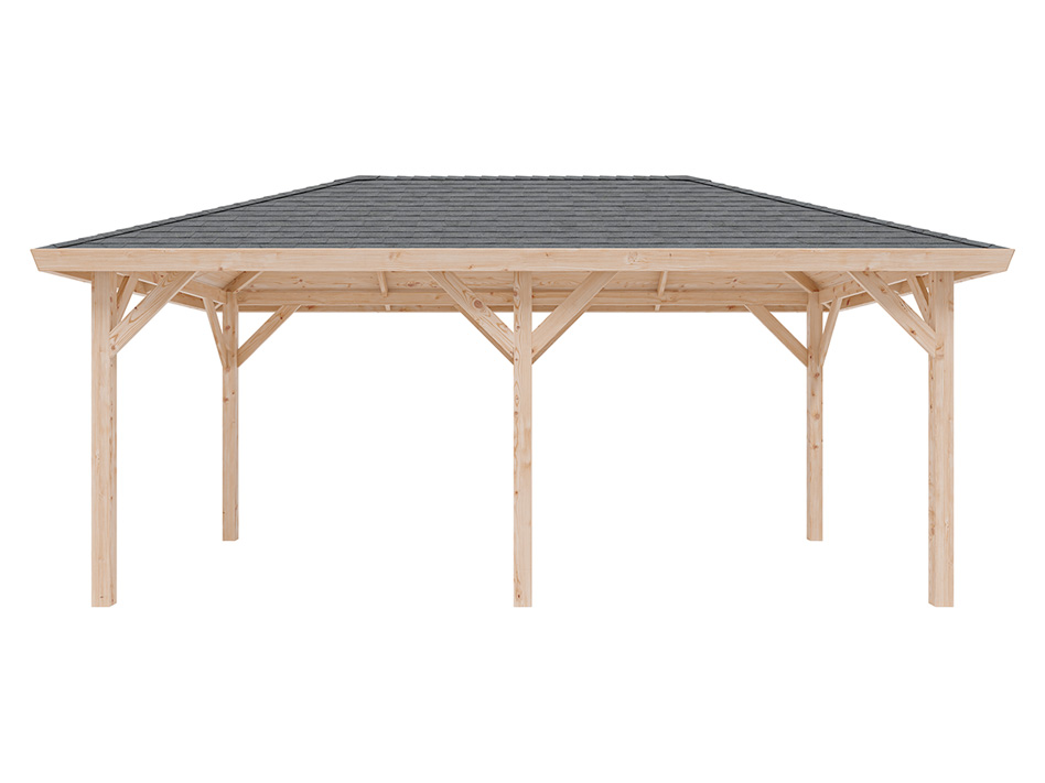 Dit hoogwaardig afgewerkte paviljoen onderscheidt zich door het zorgvuldig geselecteerde, eersteklas douglashout. Douglas behoort tot de naaldbomen en valt in duurzaamheidsklasse 3. Het bruinrode tot gelige hout heeft een krachtige nerf met uitgesproken jaarringen, wat resulteert in een levendig, karaktervol houtbeeld. Het gebruik in de scheepsbouw onderstreept de enorme weerstand van douglashout tegen weersinvloeden, mede dankzij het geringe zwel- en krimpgedrag.