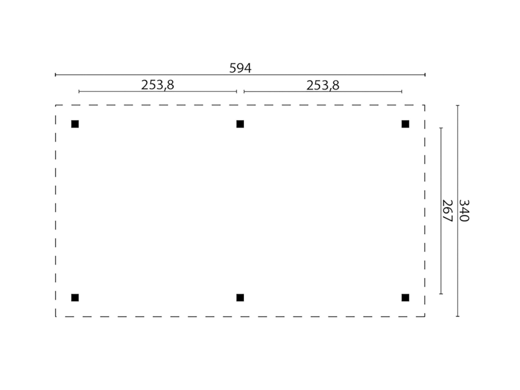 Het paviljoen heeft een breedte van 594 cm, een hoogte van 310 cm en een diepte van 340 cm. Gebruik voor het aanleggen van de fundering de plattegrond of de meegeleverde montagehandleiding als leidraad.