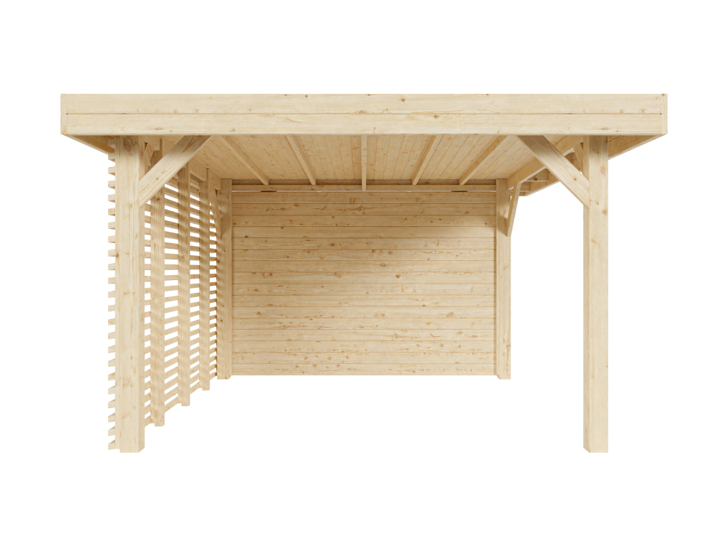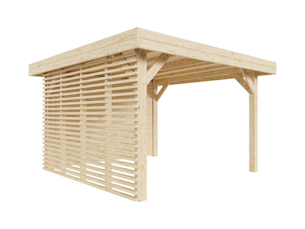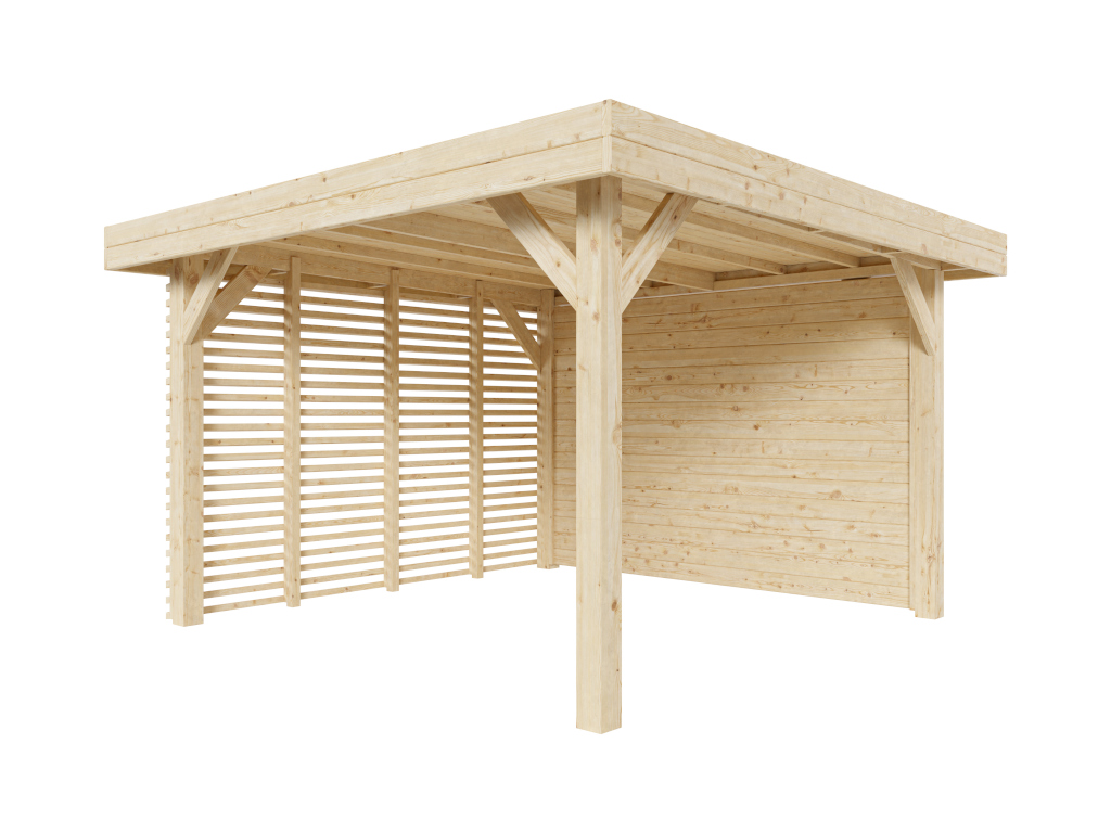 B x D x H: 350 x 350 x 226 cm, sokkelmaat B x D: 300 x 300 cm, incl. 1 lamellenwand en massieve houten wand, paaldikte 12 cm