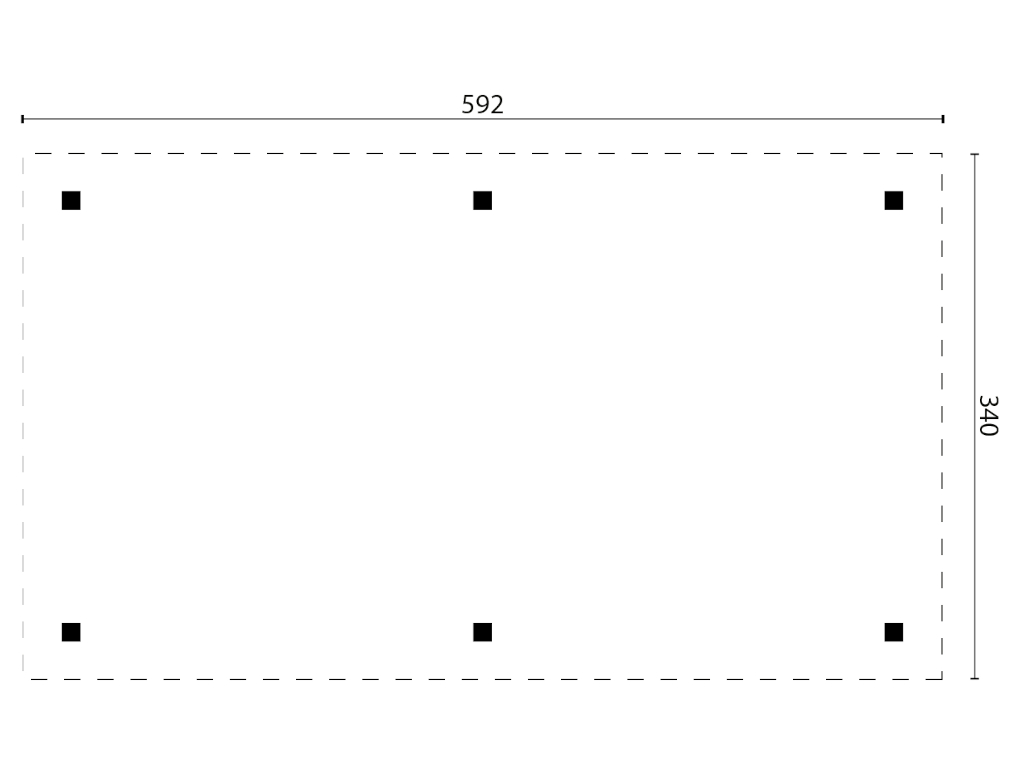 Het paviljoen heeft een breedte van 592 cm, een hoogte van 225 cm en een diepte van 340 cm. Gebruik voor het aanleggen van de fundering de plattegrond en/of de meegeleverde montagehandleiding als uitgangspunt.