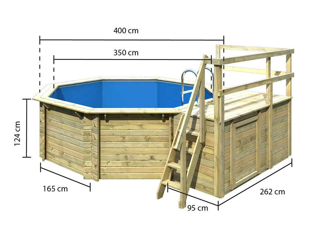 L x B x H: 480 x 400 x 124 cm, incl. dek, zwembadfolie, beschermvlies & ladder, zonneterras incl. houten treden, reling
