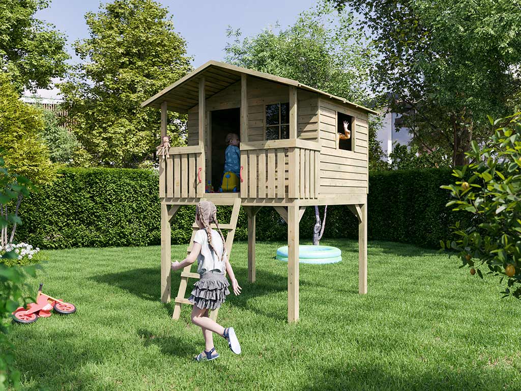 Het levendige paalhuis Leon biedt een heerlijke plek voor je kinderen om te spelen en zich uit te leven. Grote klasse voor de kleintjes - de nieuwe SMART-huizen bieden puur plezier. Op een zeer klein oppervlak ontstaat een speelparadijs - ruimte voor beweging en fitness voor de kinderen. De wanden met de overlappende lamellen zijn visueel opvallend. - Stevige basisconstructie
