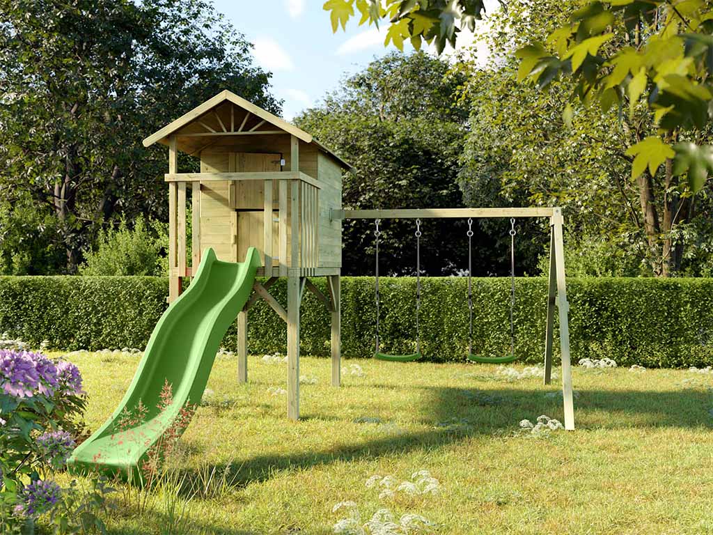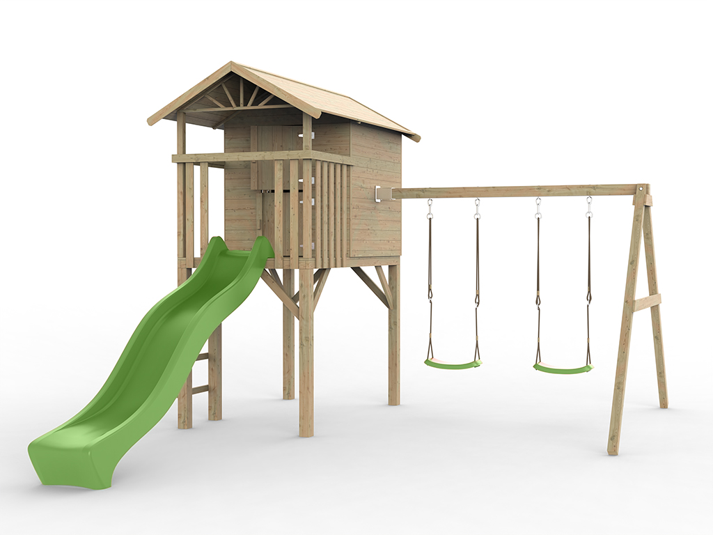 Geïmpregneerd houten speelhuisje op palen "Tree Hut" met dubbele schommel en groene golvende glijbaan Prestige Garden