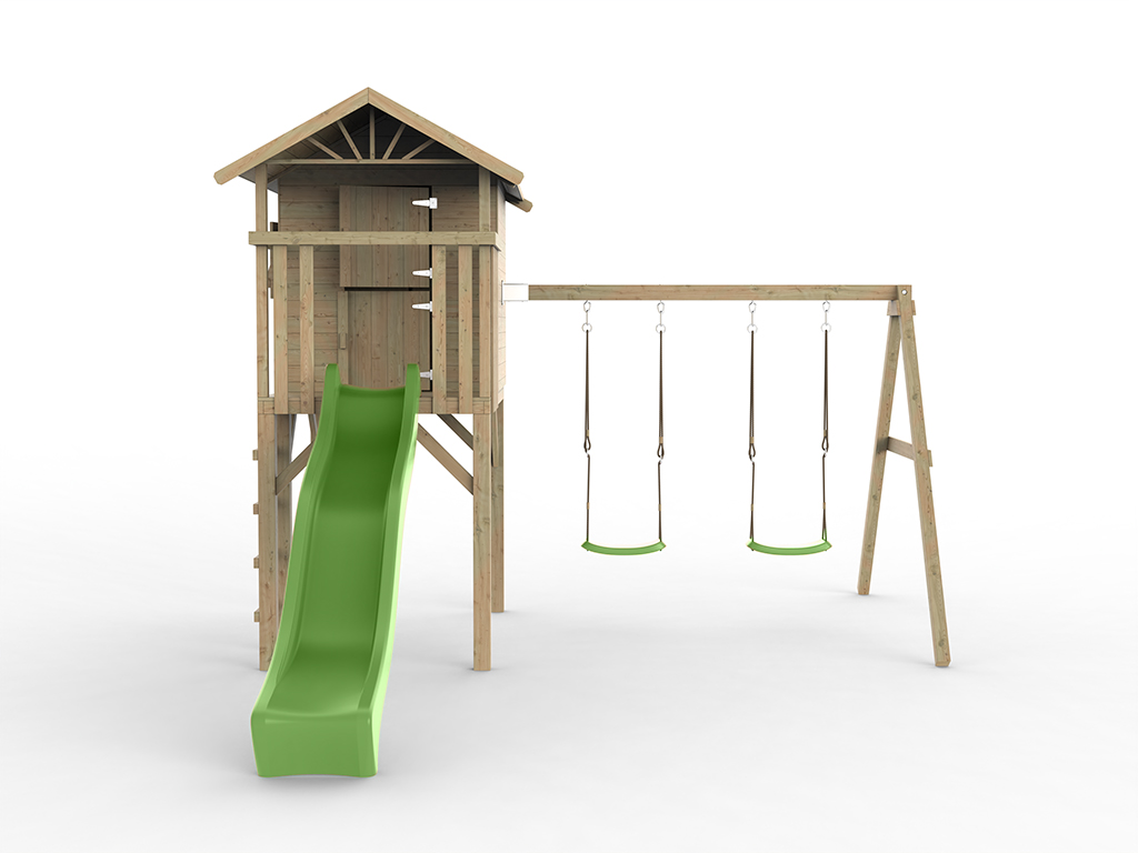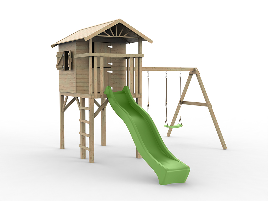 Geïmpregneerd houten speelhuisje op palen Tree Hut incl. dubbele schommel en groene glijbaan