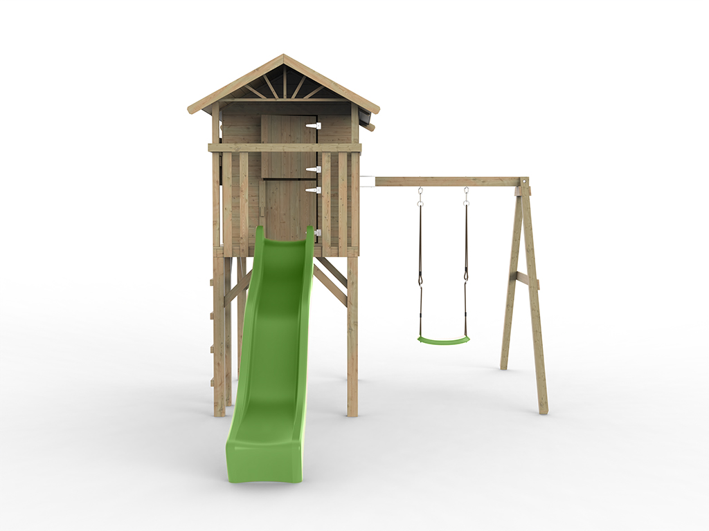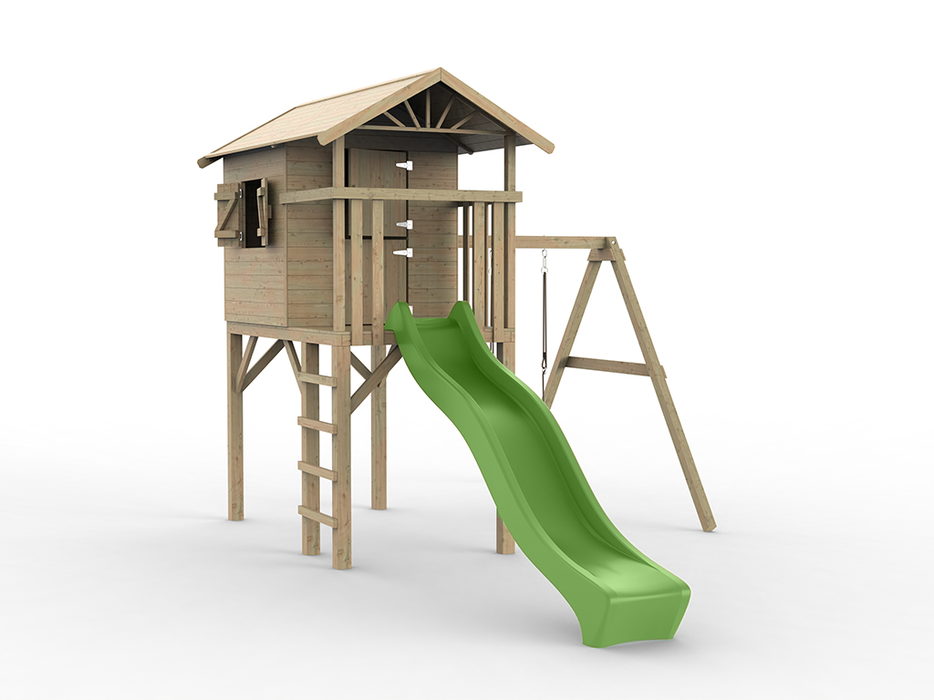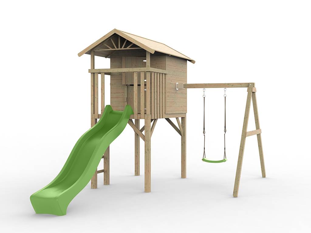 Geïmpregneerd speelhuisje op palen "Tree Hut" incl. enkele schommel en groene glijbaan