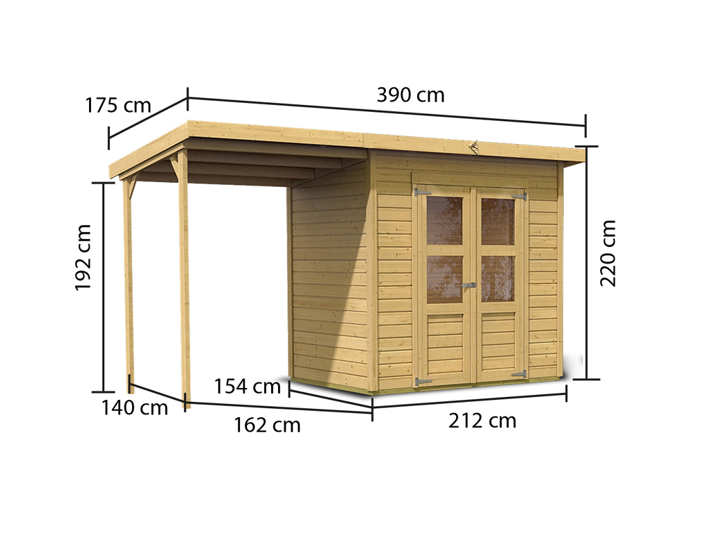 B x D x H: 390 x 175 x 220 cm, Basisafmetingen: B x D: 208 x 150 cm, incl. Aanbouwdak