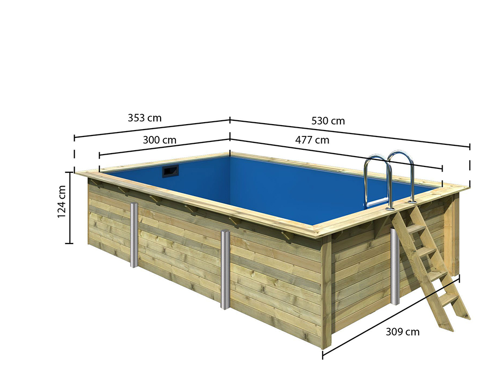 De royale grootte van het zwembad is bijzonder aangenaam. Met een breedte van 530 cm, diepte van 350 cm en hoogte van 124 cm (waterdiepte 111 cm) biedt het zwembad voldoende ruimte om thuis alleen te ontspannen met een koud drankje of met vrienden na het werk of in het weekend een kleine break in te lassen. De robuuste wanddikte van 44 mm biedt veiligheid. De leveringsomvang omvat ook een zwembadfolie, die zorgt voor een aangename loopervaring en de binnenkant van het zwembad visueel verbetert. Bovendien wordt de zwembadfolie over het hout geplaatst, zodat er geen water uit het zwembad kan ontsnappen. Tegelijkertijd is je zwembad beschermd tegen alle weersomstandigheden, zodat elke winter veilig kan worden doorstaan en de volgende zomer kan komen. Met betrekking tot installatie en onderhoud biedt de zwembadfolie nog meer voordelen. De folie is gemakkelijk te plaatsen en kan indien nodig worden vervangen. Het ontwerp van het zwembad zelf biedt je te allen tijde de grootste flexibiliteit.